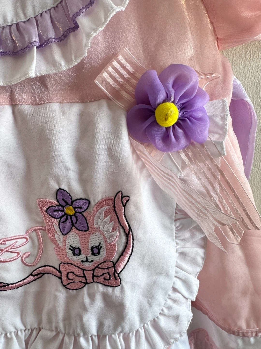 This adorable pink dress features a cute Linabell embroidery on the front bib and ruffled details. It has a layered skirt with pom-pom trim and sheer puff sleeves. A darling outfit for any little one!