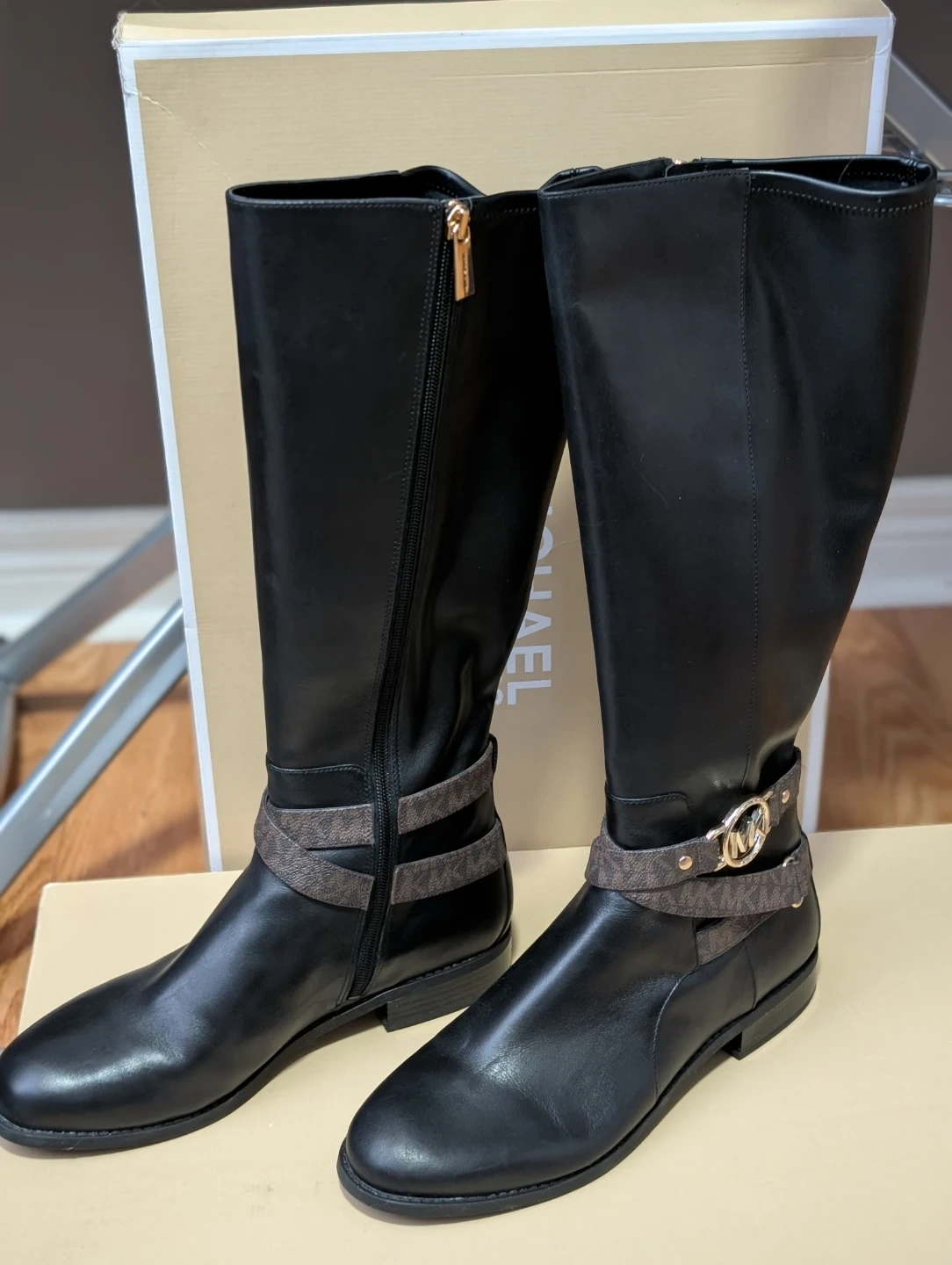 These are black leather tall boots from Michael Kors. They feature the signature MK logo print straps with gold-tone hardware and side zippers. Comes with the original box.