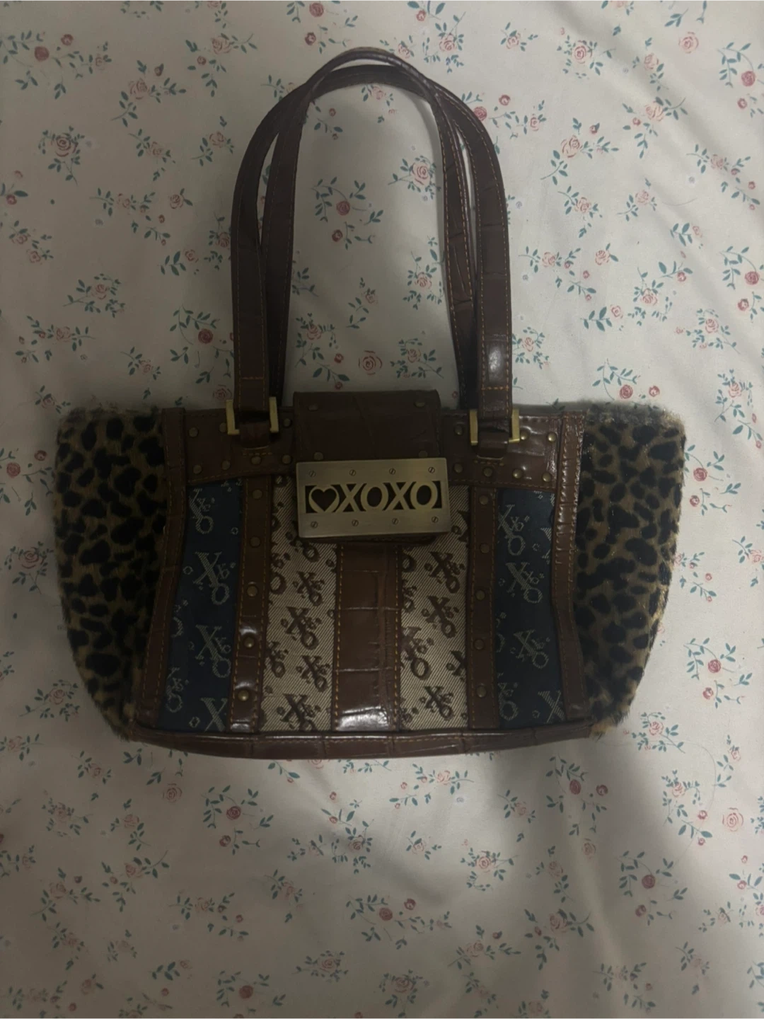 This XOXO shoulder bag features a stylish monogram pattern with leopard print accents on the sides. It has faux fur trim and faux leather handles. A chic accessory for your everyday essentials!#2000s