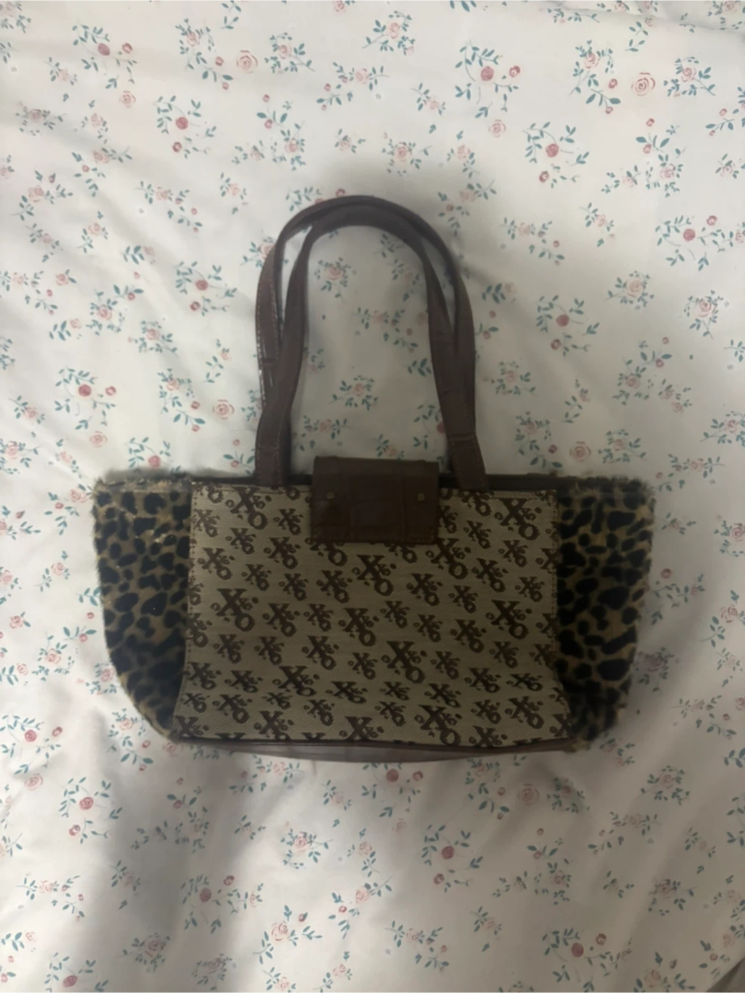 This XOXO shoulder bag features a stylish monogram pattern with leopard print accents on the sides. It has faux fur trim and faux leather handles. A chic accessory for your everyday essentials!#2000s
