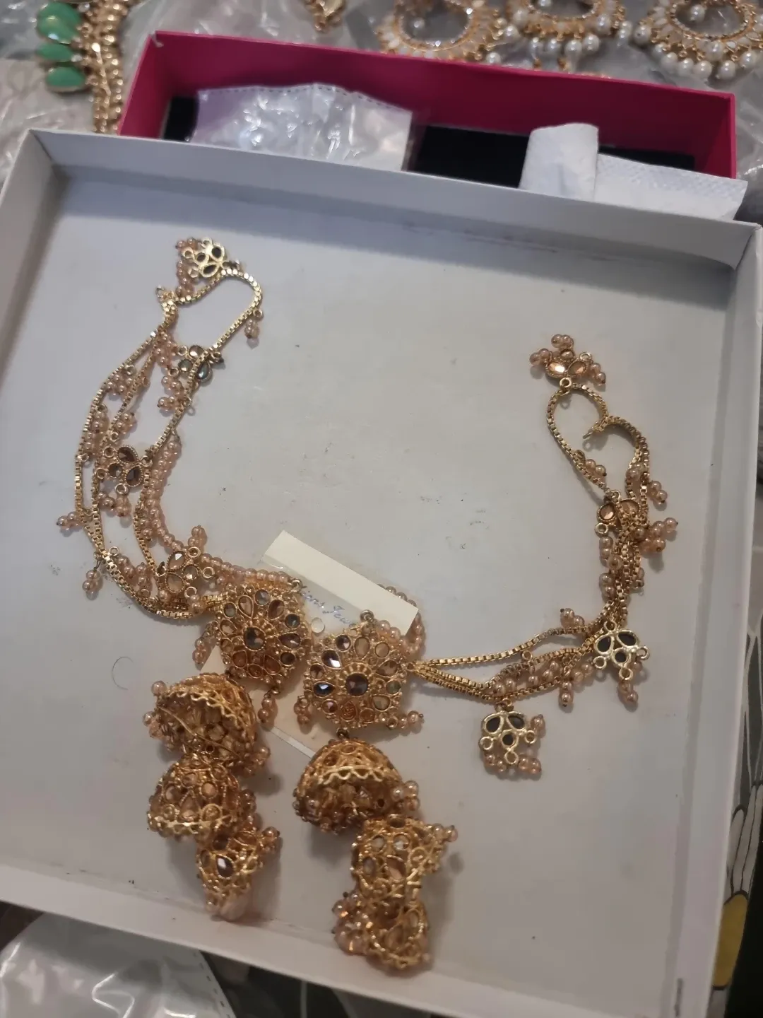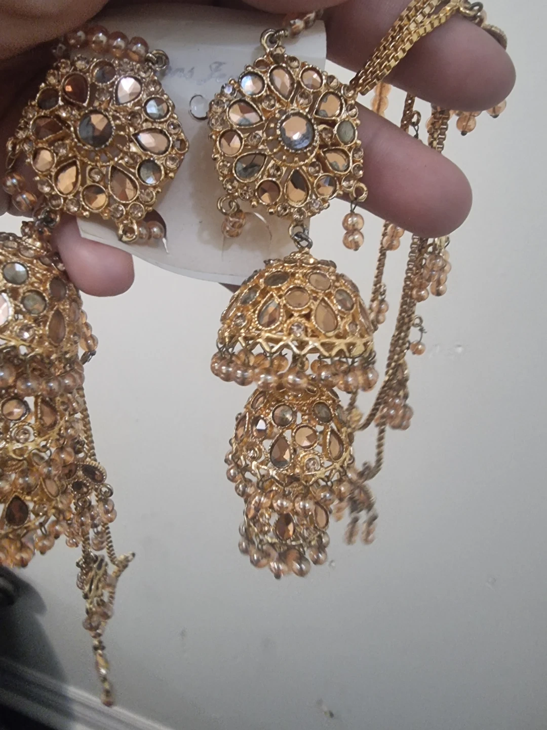 A set of elegant gold-tone jhumka earrings, embellished with pearls and decorative stones. These earrings feature intricate designs and dangly elements. They're perfect for adding a touch of sparkle to traditional outfits!