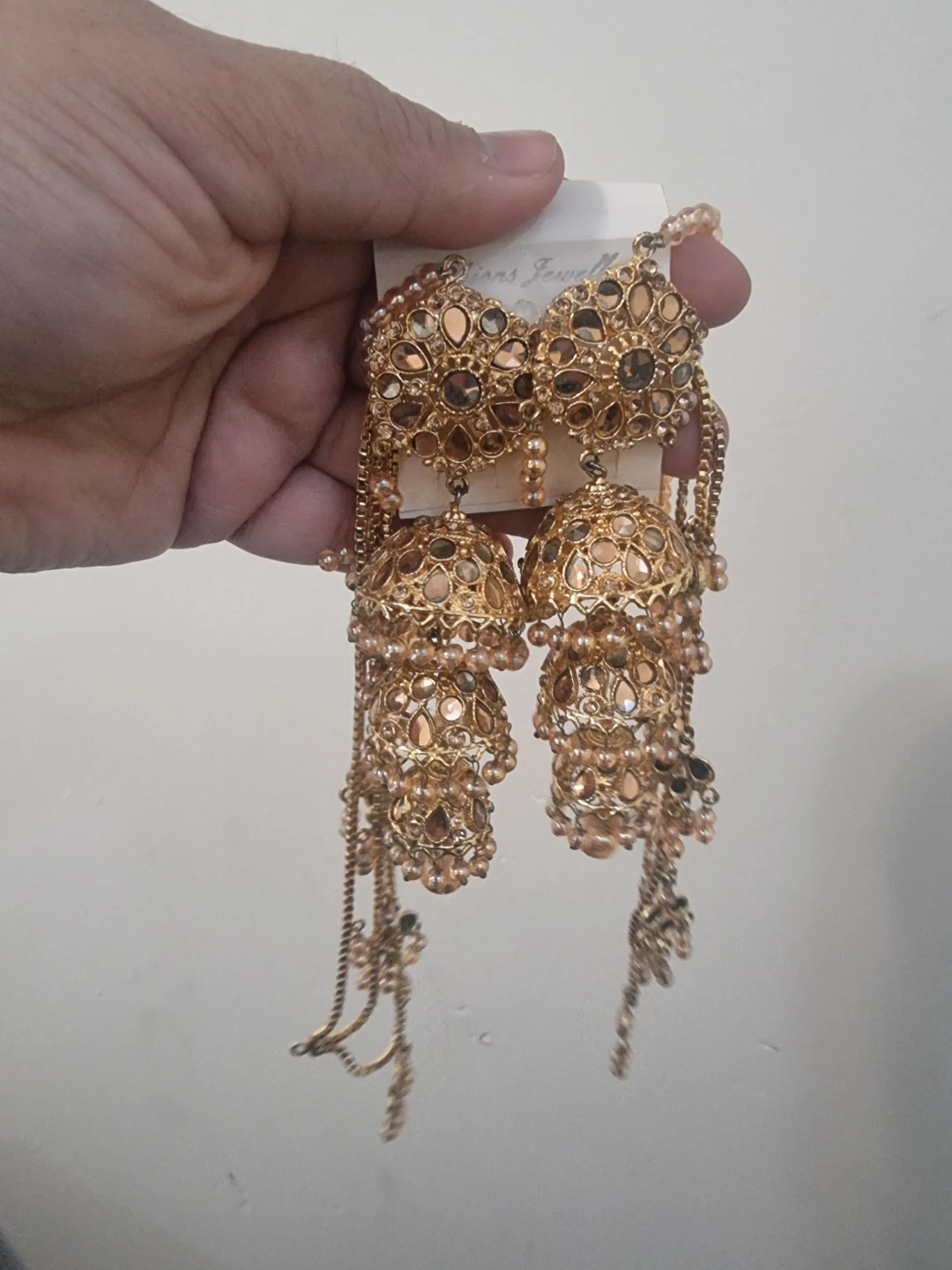 A set of elegant gold-tone jhumka earrings, embellished with pearls and decorative stones. These earrings feature intricate designs and dangly elements. They're perfect for adding a touch of sparkle to traditional outfits!