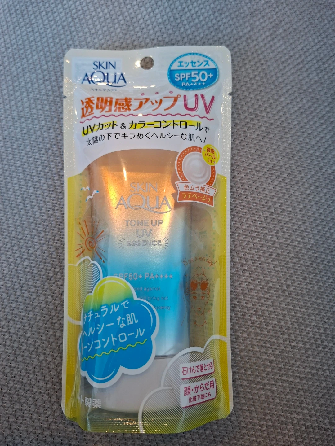 This Skin Aqua Tone Up UV Essence offers UV protection and colour control. It helps to create a brighter, healthier-looking complexion. It's suitable for face and body, and can be used as a makeup base.its beige tone up UV sunscreen, suits all skin tones and easily Washes off with soap.
