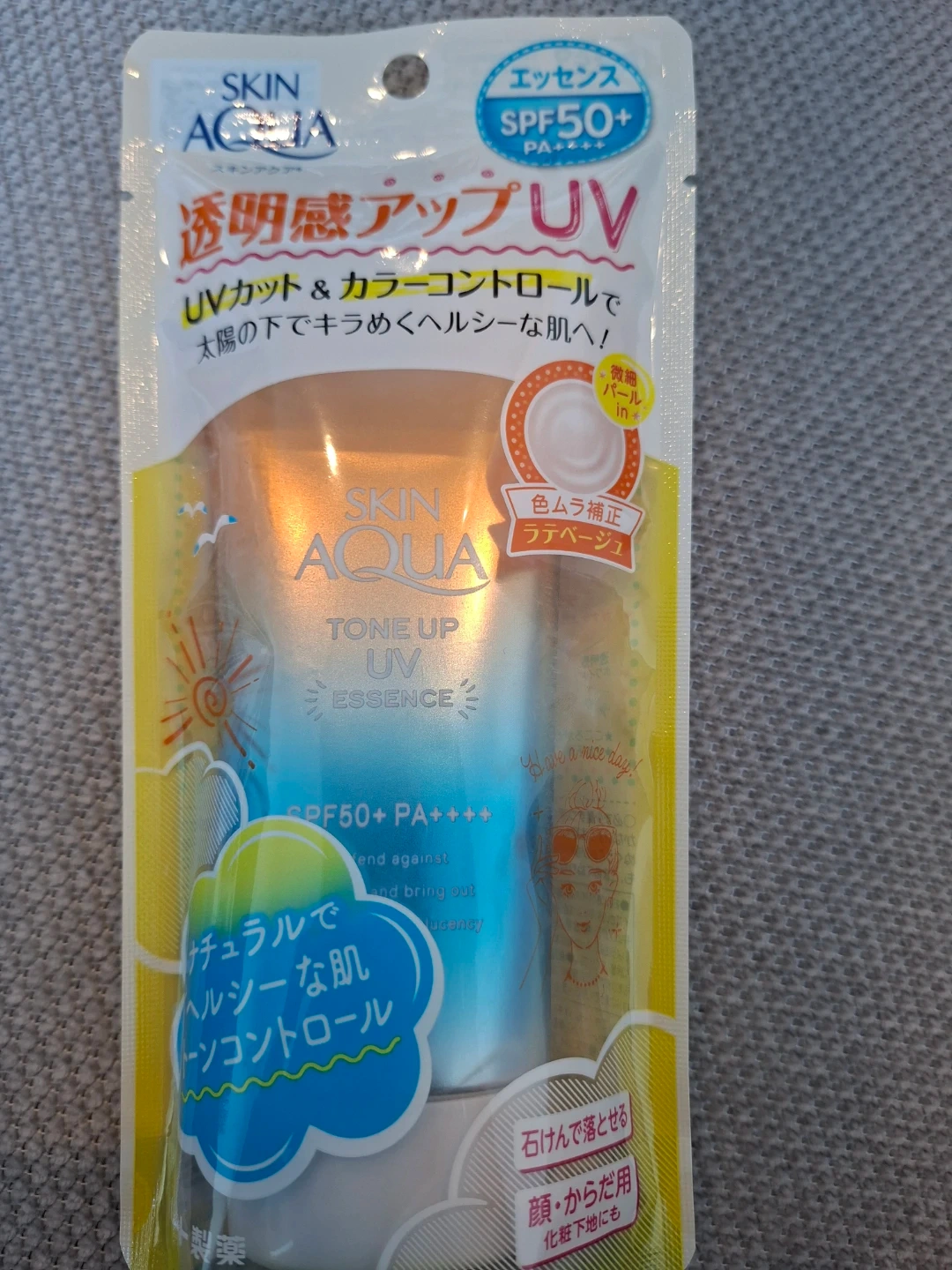 This Skin Aqua Tone Up UV Essence offers UV protection and colour control. It helps to create a brighter, healthier-looking complexion. It's suitable for face and body, and can be used as a makeup base.its beige tone up UV sunscreen, suits all skin tones and easily Washes off with soap.