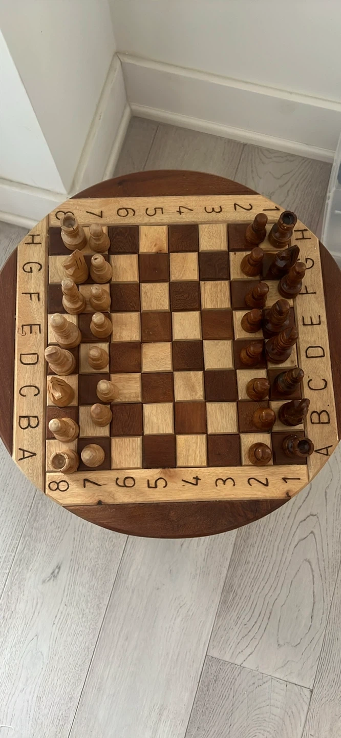 This is a classic wooden chess set with a folding board. It's perfect for bringing along on trips or for playing at home. The set includes all the pieces needed for a game. A great choice for chess enthusiasts of all ages!