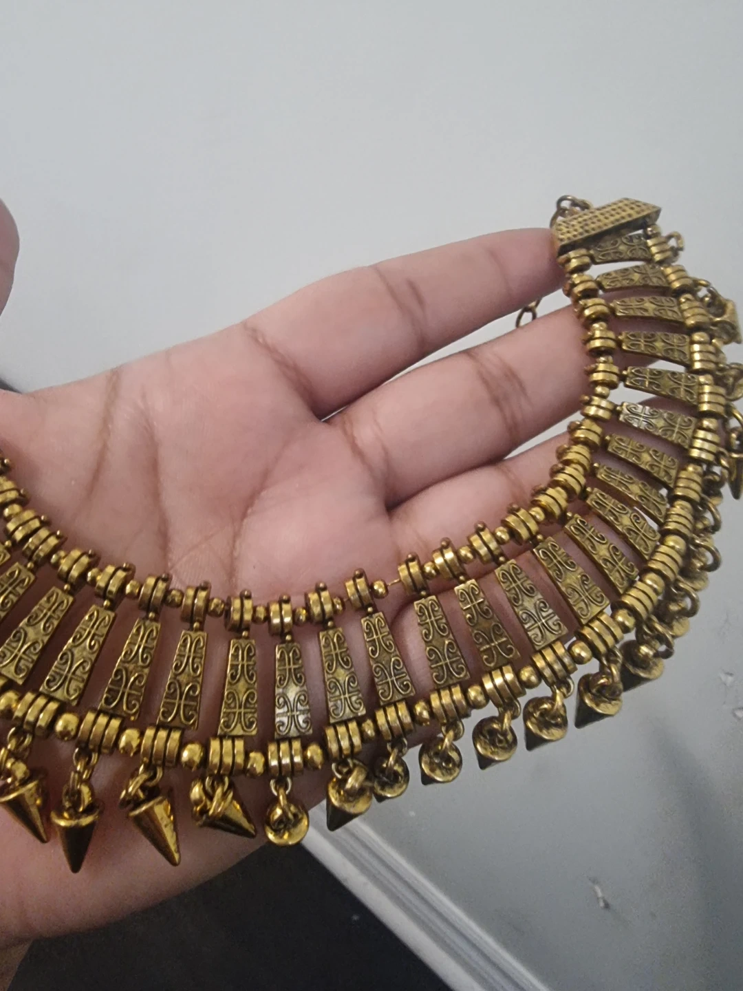 This intricate gold-tone statement necklace features a bib-style design with dangling conical charms. It's crafted from a metal alloy with an antiqued finish. Perfect for adding a unique touch to any outfit!