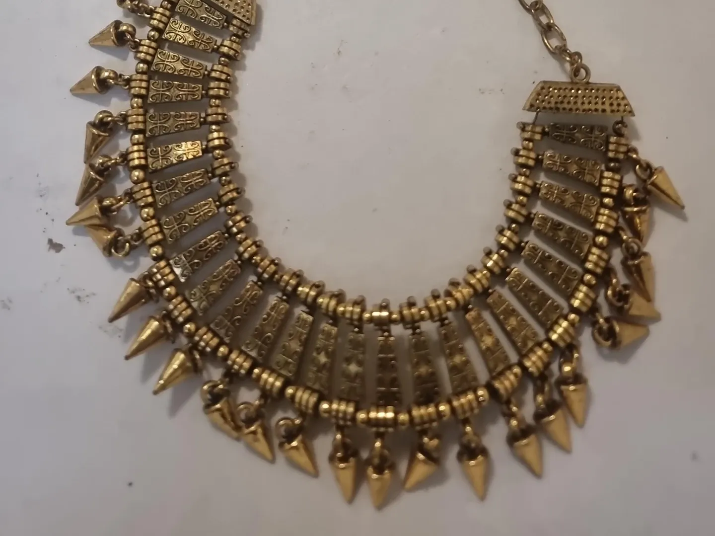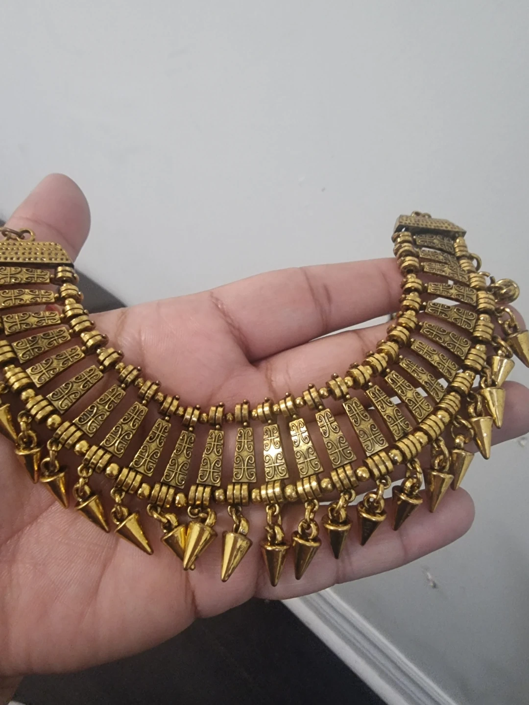 This intricate gold-tone statement necklace features a bib-style design with dangling conical charms. It's crafted from a metal alloy with an antiqued finish. Perfect for adding a unique touch to any outfit!