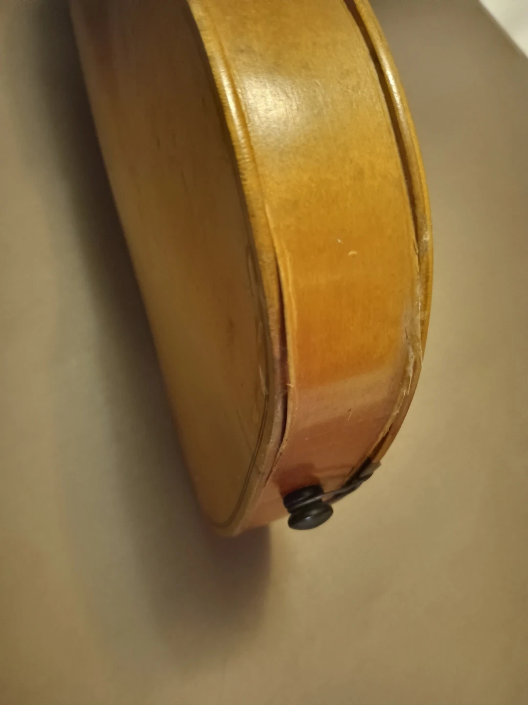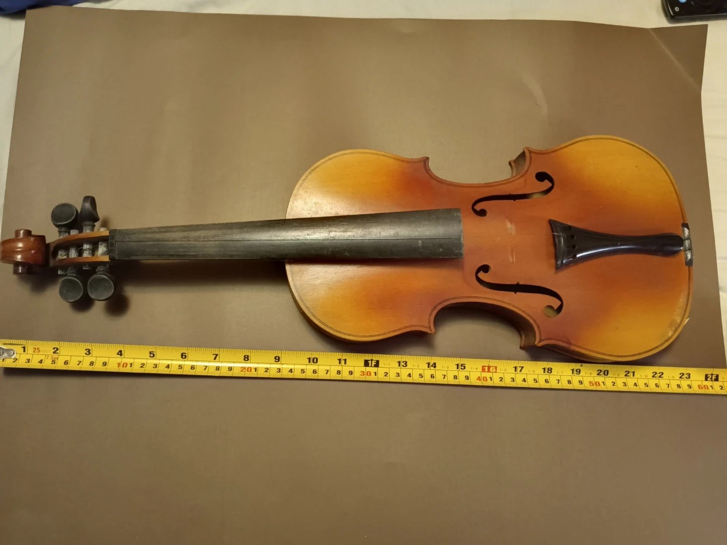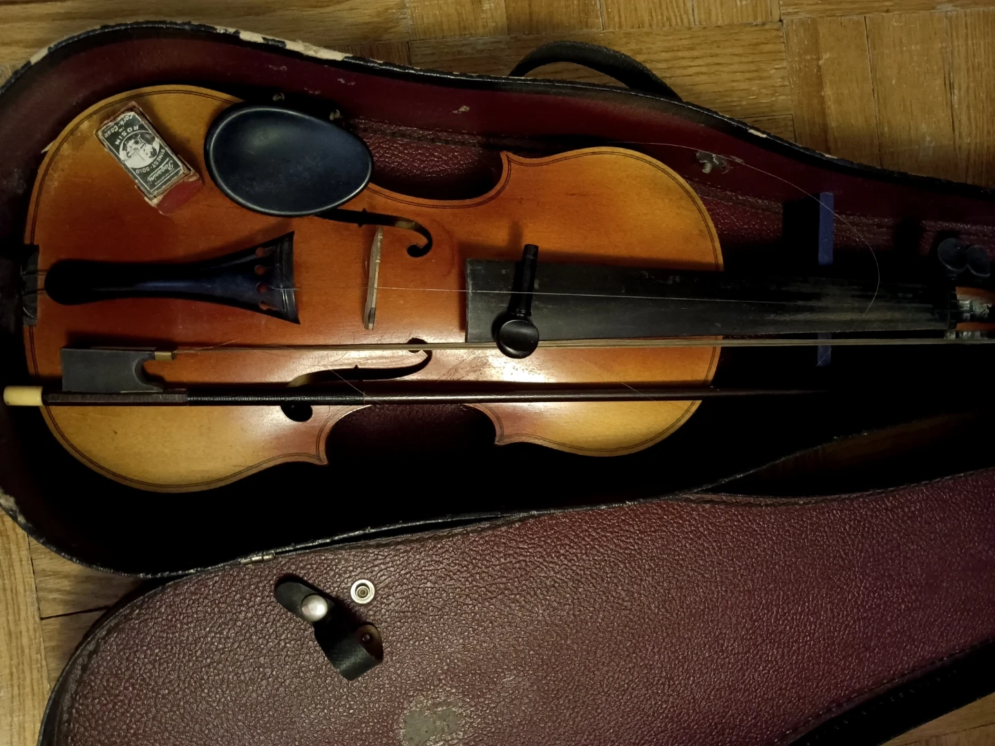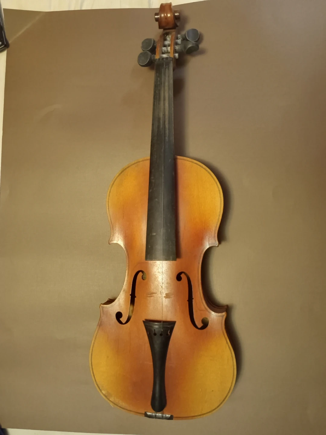 This is a Metzo Violin, made in Toronto in 1946. It features a classic wooden body and ebony fingerboard. This instrument would be a great find for a collector or student.