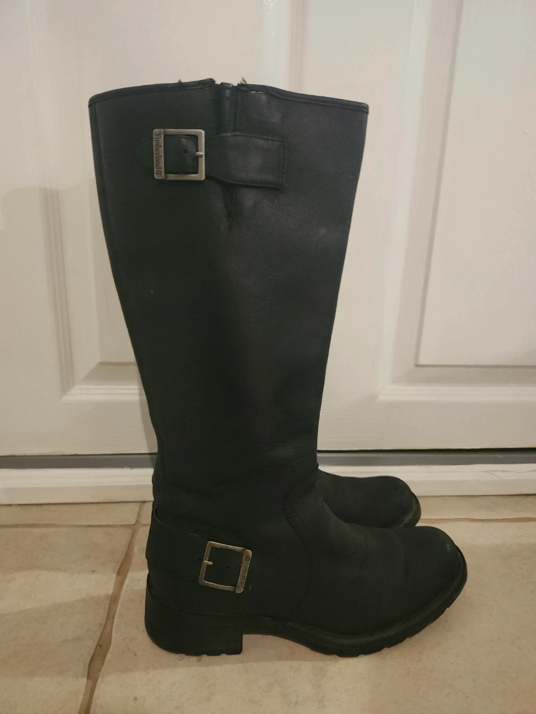 Classic black leather knee-high boots from Timberland. Features a side zipper and decorative buckle detail. Durable sole for good traction. Perfect for everyday wear!