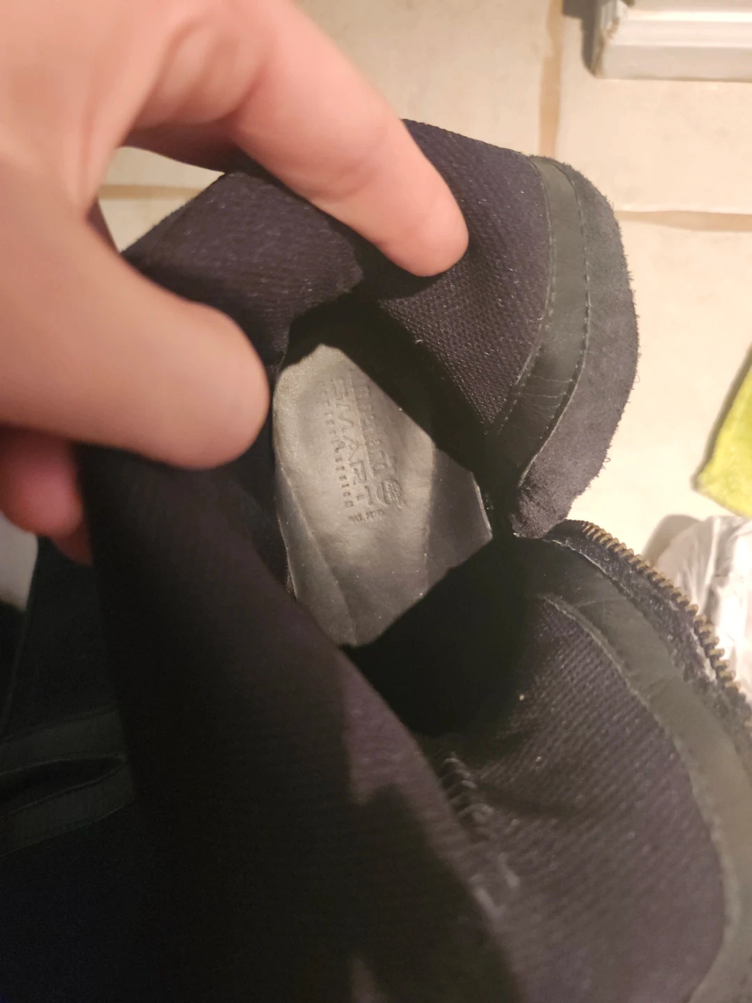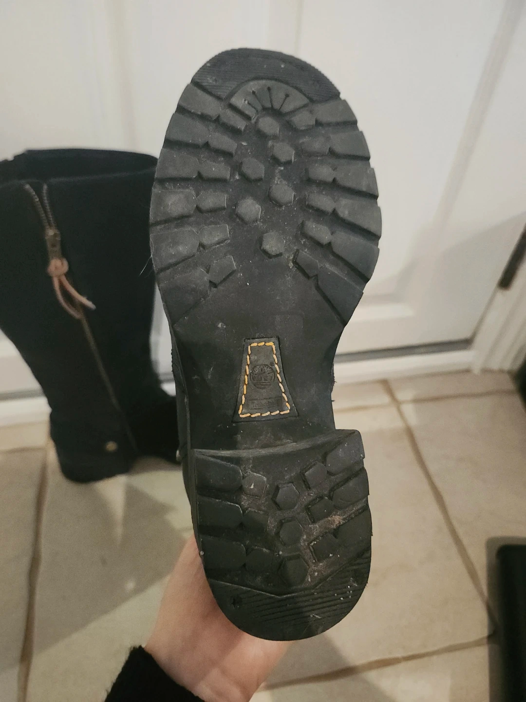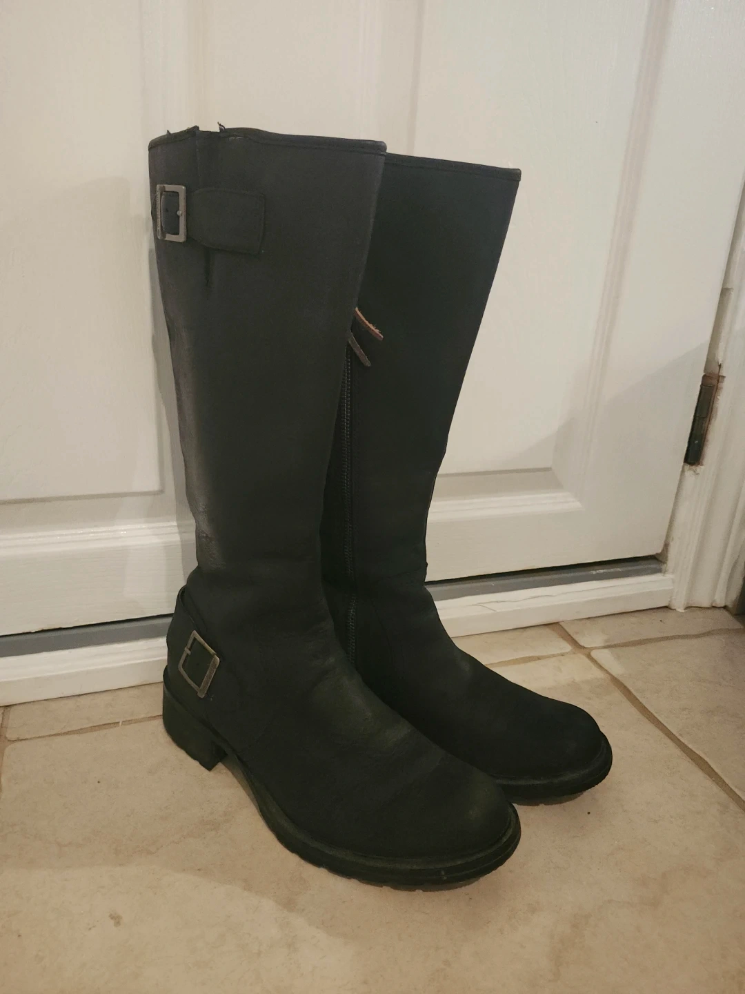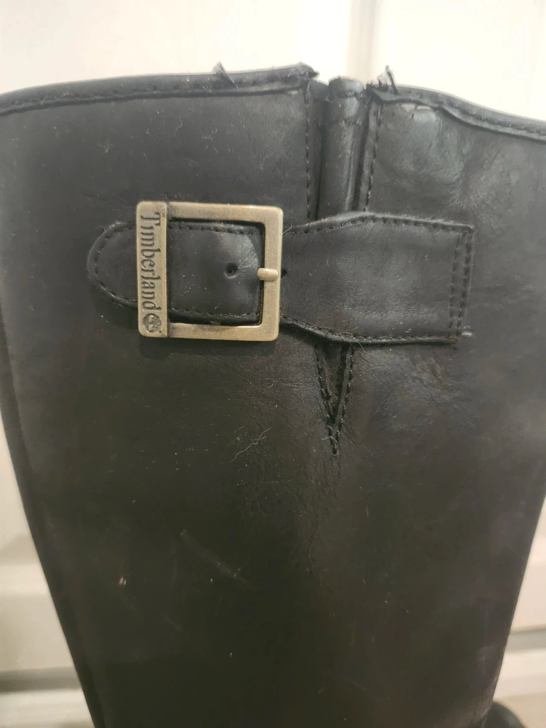 Classic black leather knee-high boots from Timberland. Features a side zipper and decorative buckle detail. Durable sole for good traction. Perfect for everyday wear!