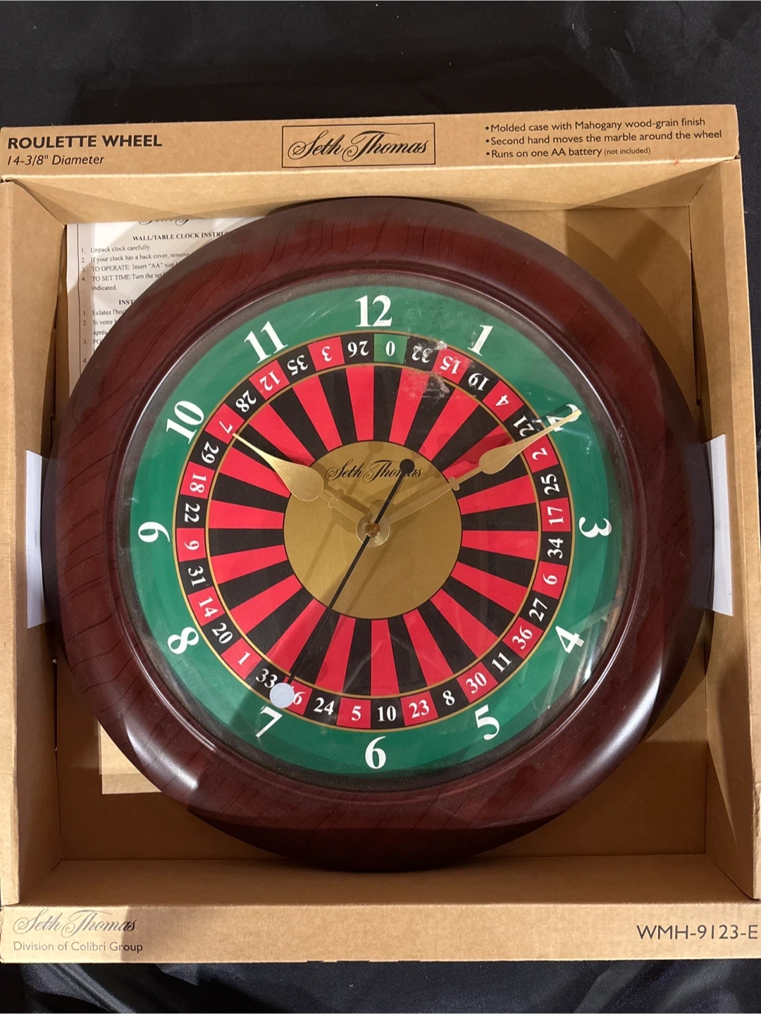 New!!Seth Thomas roulette wheel clock, 14-3/8" diameter. It's a molded case with mahogany wood-grain finish. Second hand moves the marble around the wheel. Runs on one AA battery (not included). Collectable!!