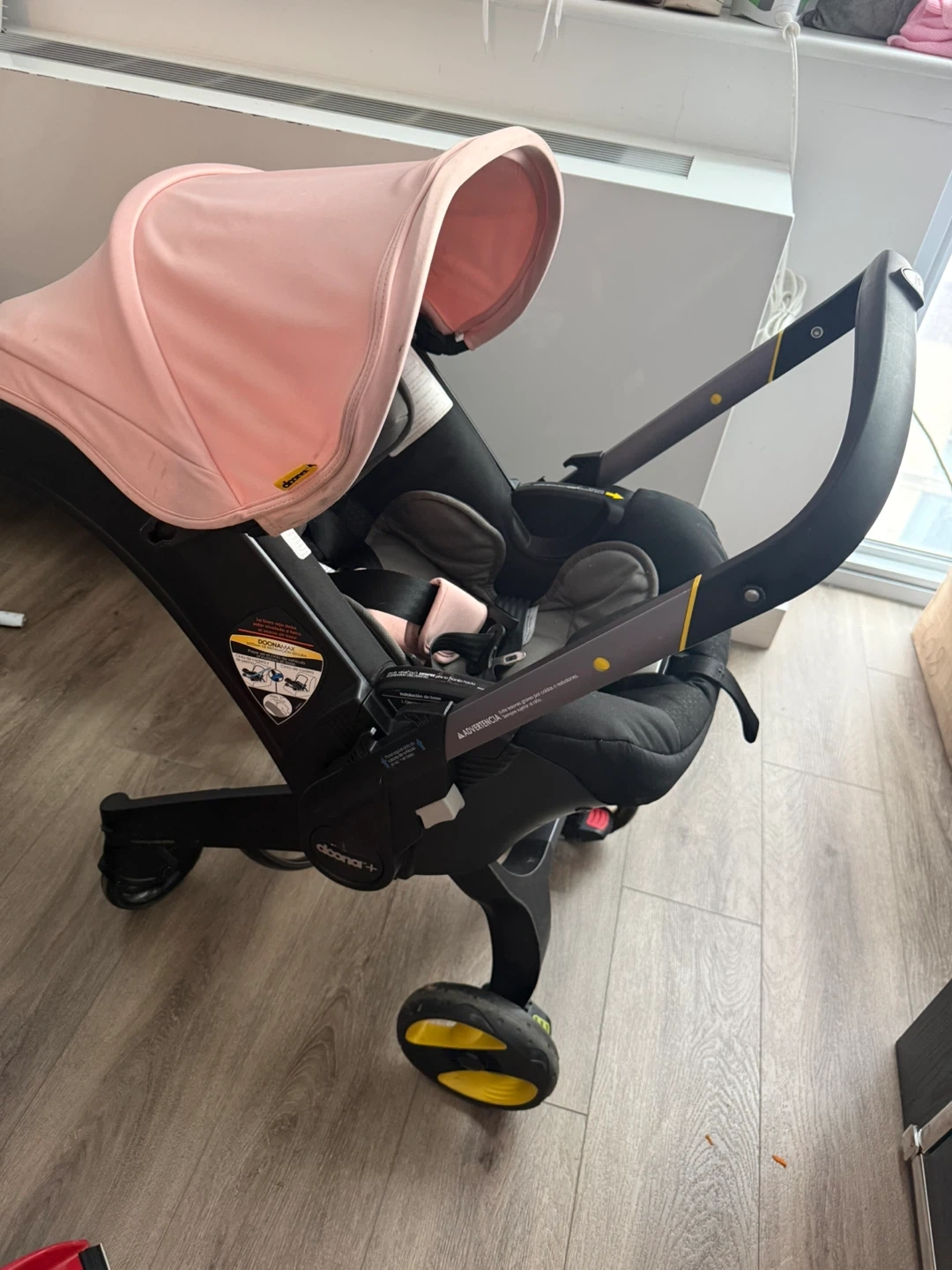 This is a Doona+ infant car seat and stroller system. It's designed for travel and easy transitions. It includes the car seat and base for secure installation.
