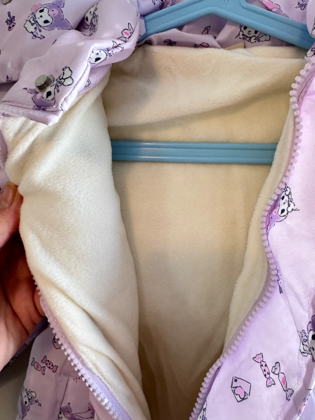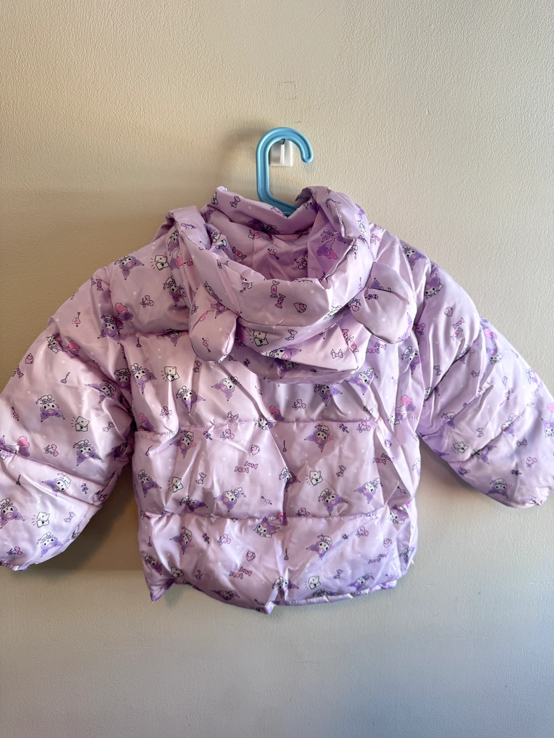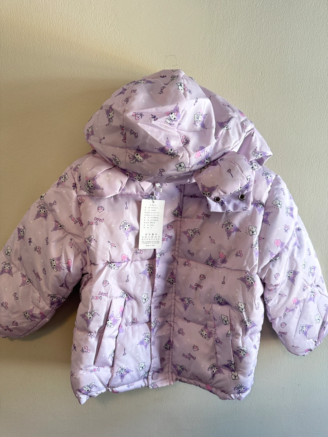 This adorable puffer jacket features a cute Kuromi print all over in a fun purple shade. It's fully lined for extra warmth. Perfect for keeping little ones cozy on chilly days!