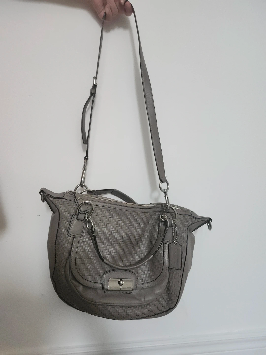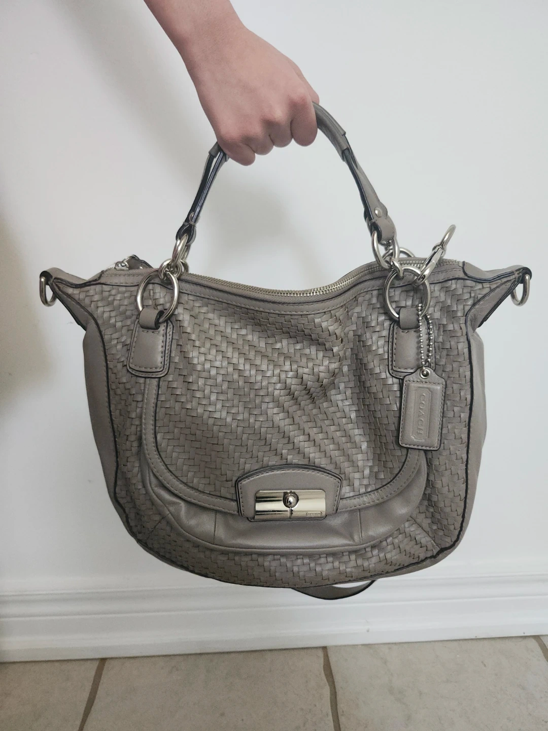 Beautiful Coach shoulder bag in a lovely grey. It's crafted from woven leather and has silver hardware. Interior features multiple pockets for organization. Includes a removable crossbody strap.