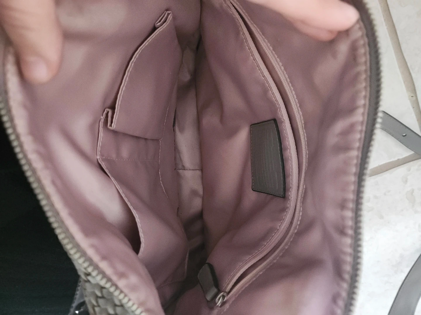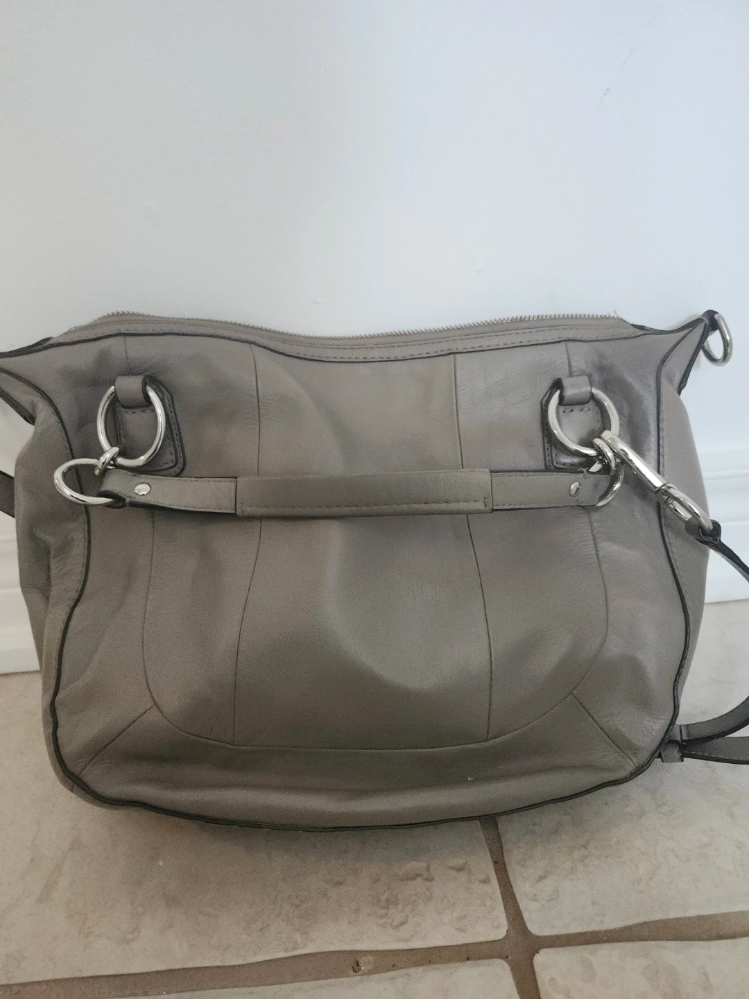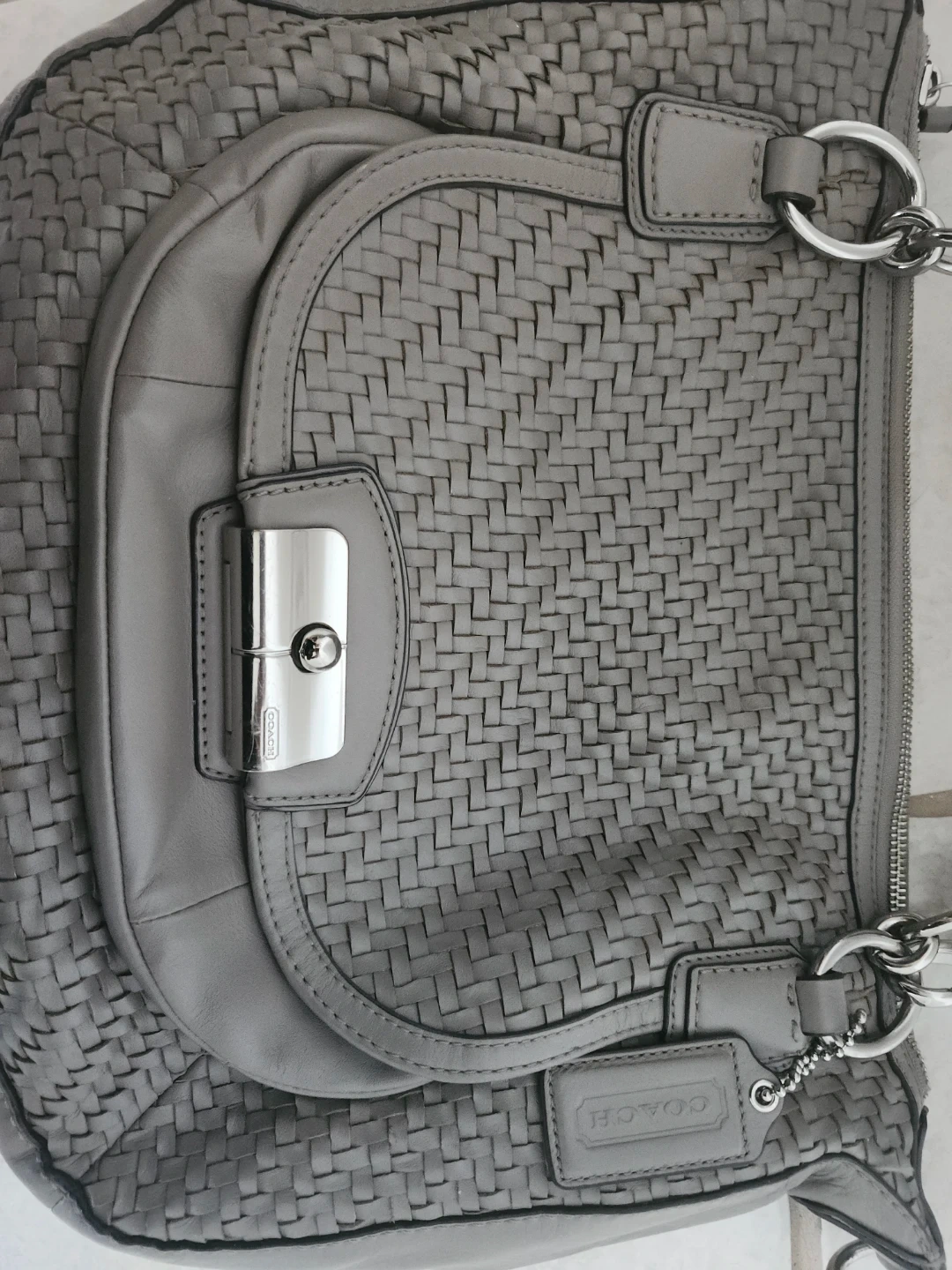 Beautiful Coach shoulder bag in a lovely grey. It's crafted from woven leather and has silver hardware. Interior features multiple pockets for organization. Includes a removable crossbody strap.