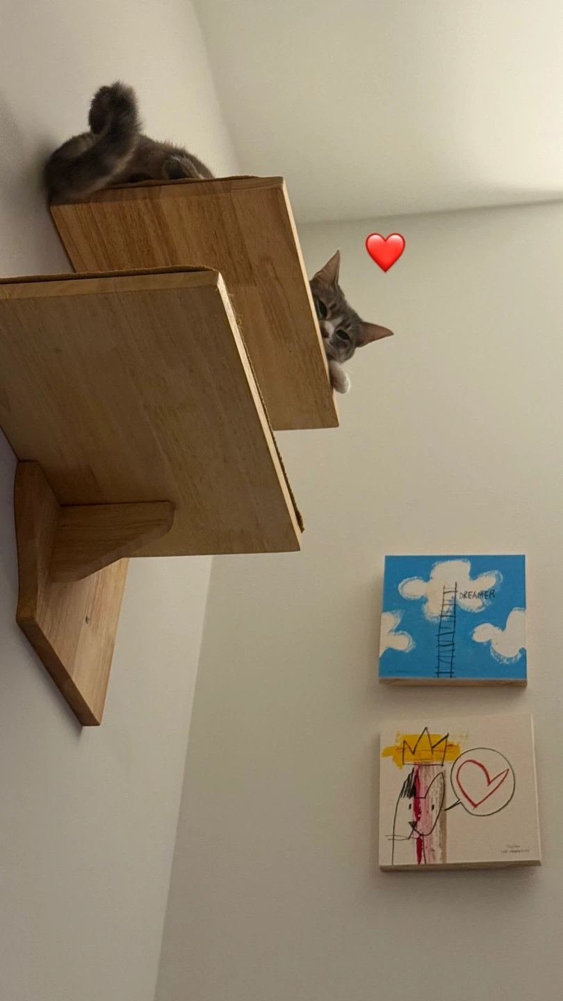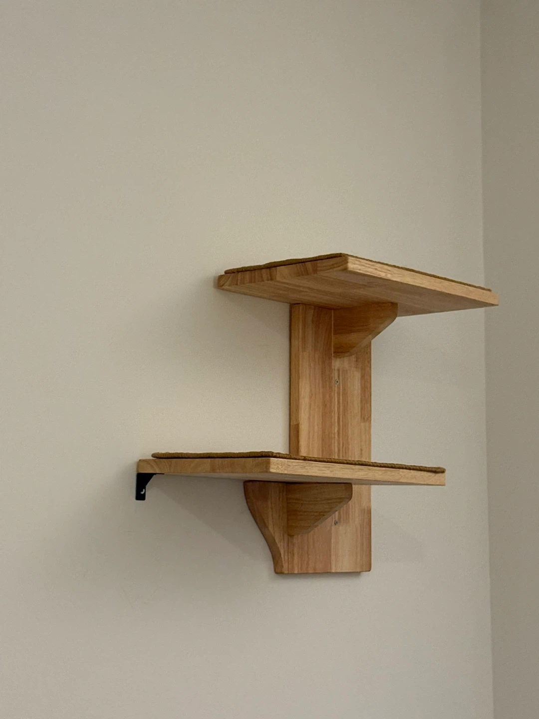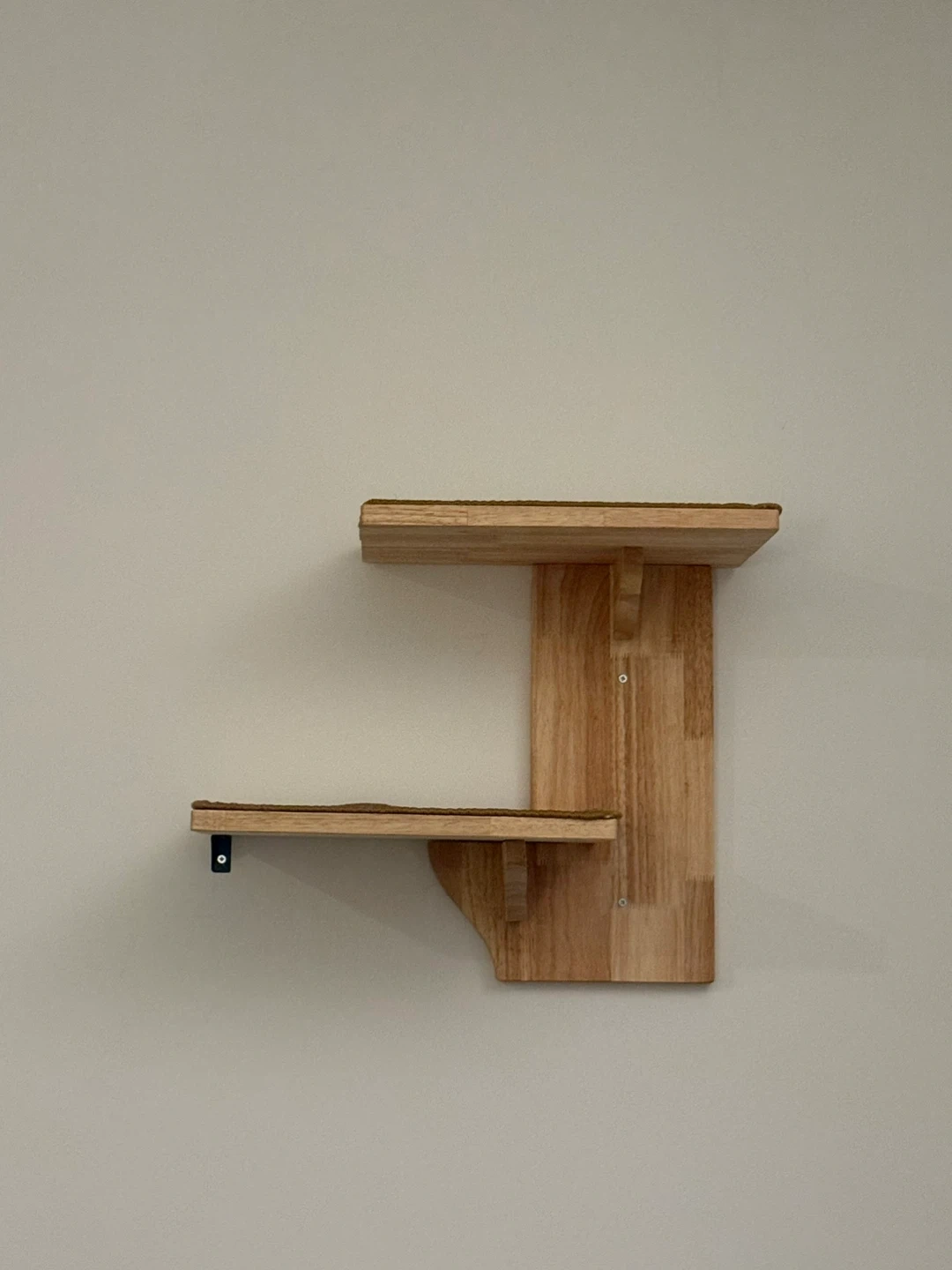 This wall-mounted cat shelf is made of natural wood. It features two levels with sisal matting for climbing and resting. Easy to attach to your wall for your feline friend's enjoyment!