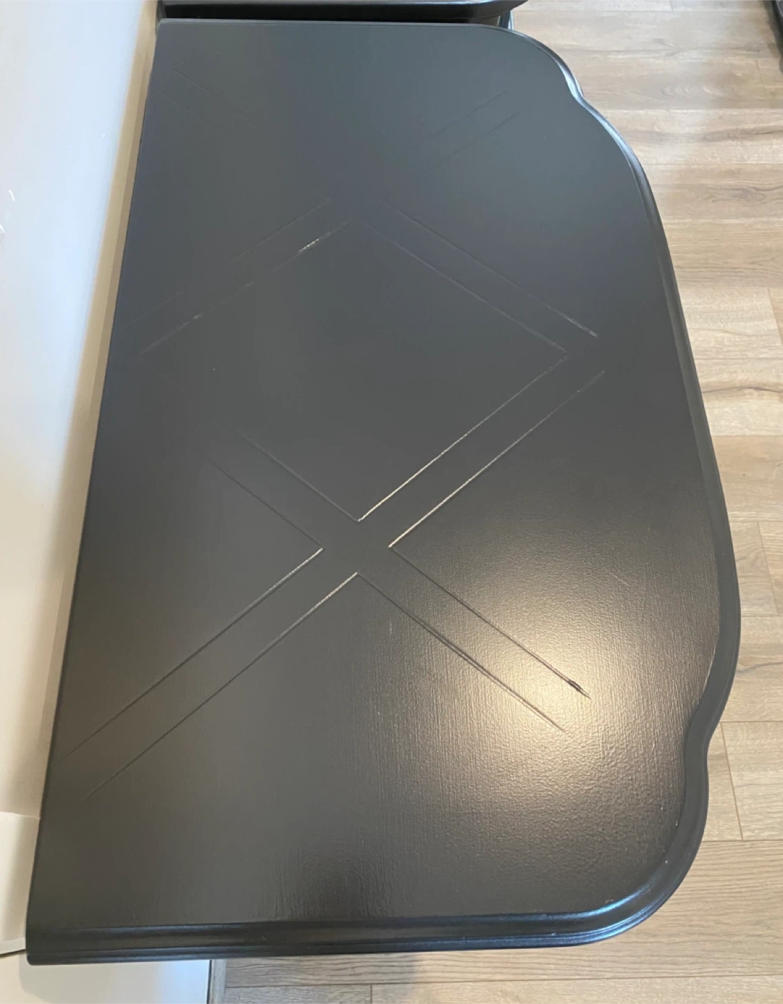 Lots of mouldings and curved drawers, top features cross cross design, scalloped edges
