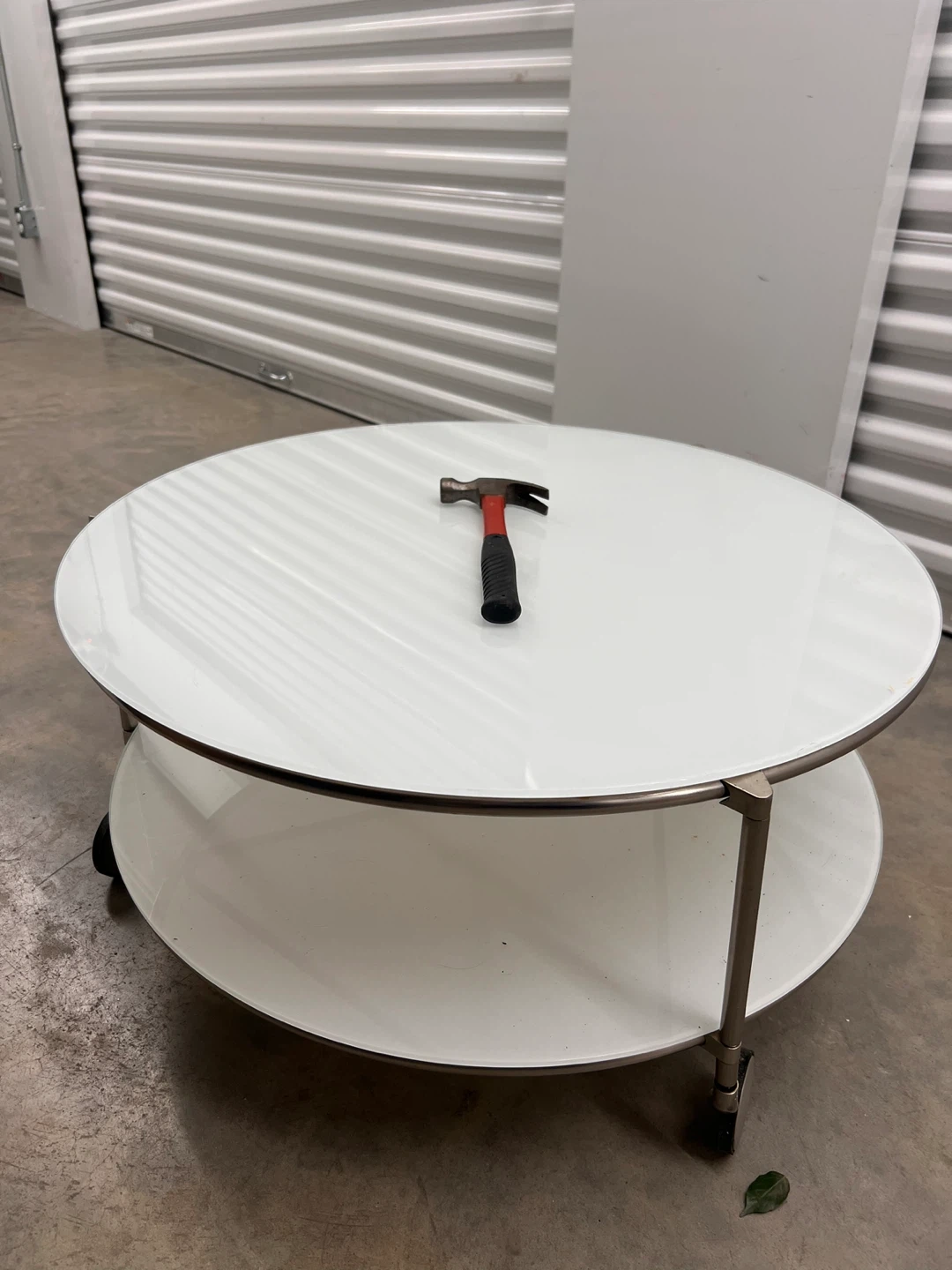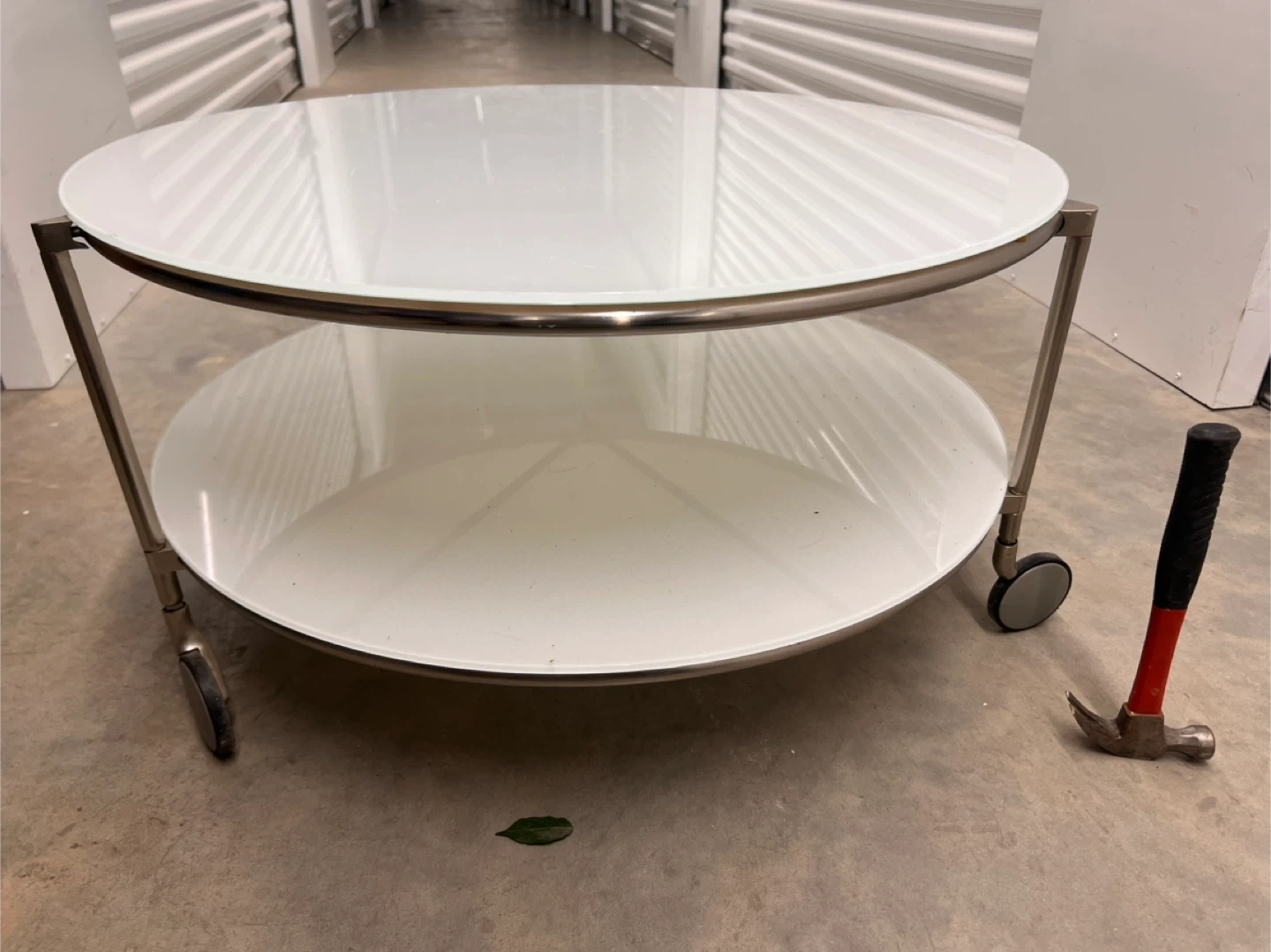 This round glass coffee table features a sleek white top and a second shelf for extra storage. It's designed with a modern metal frame and has wheels for easy movement. The glass material makes for a durable and stylish addition to your living space.