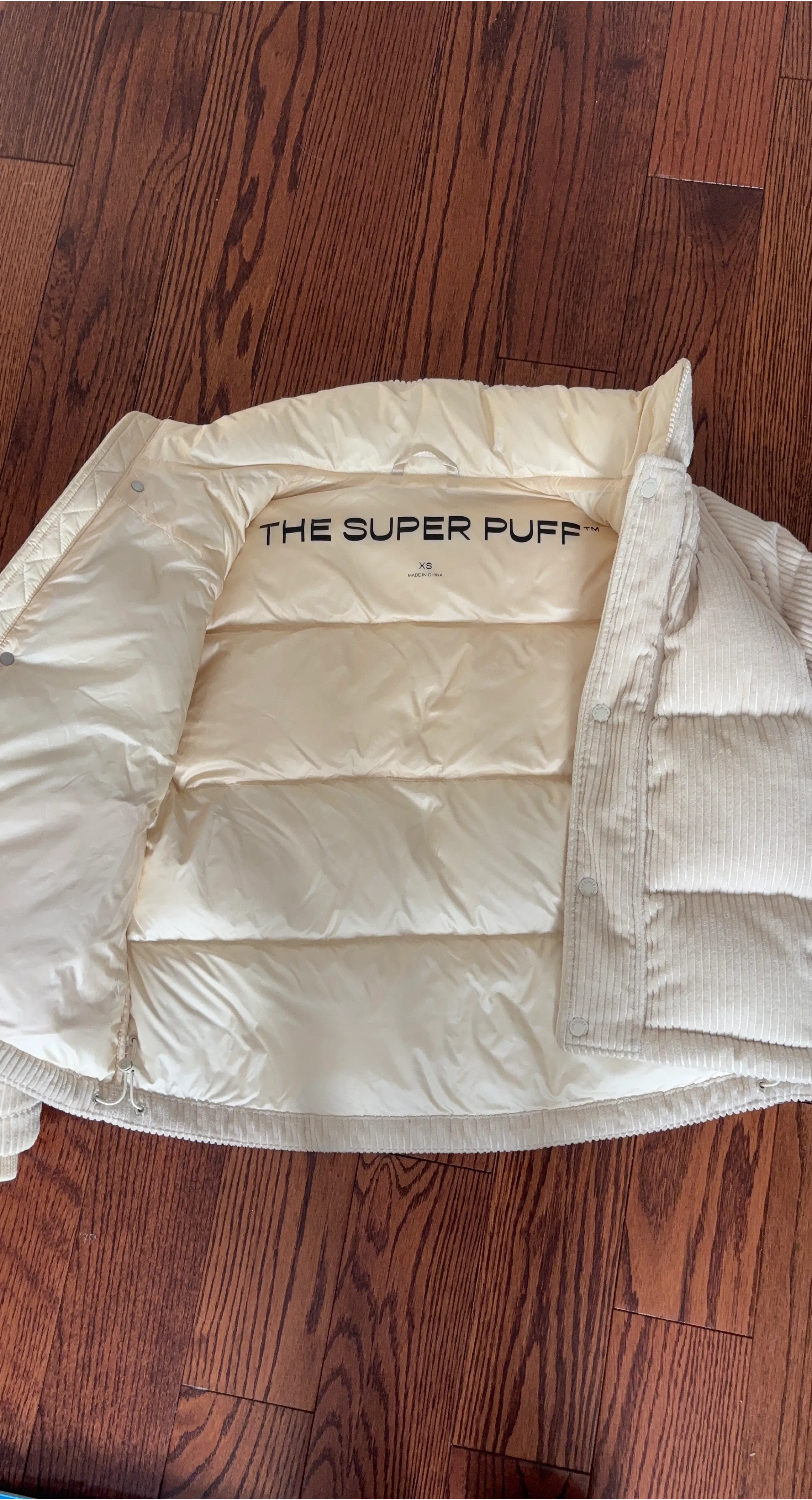 The Super Puff puffer jacket in cream. It's a size XS with a corduroy exterior. It features a full zip closure with snap buttons.