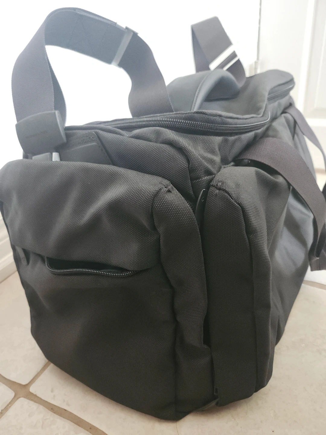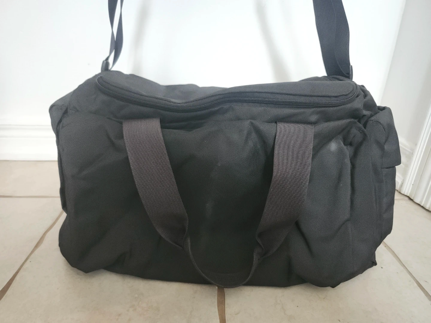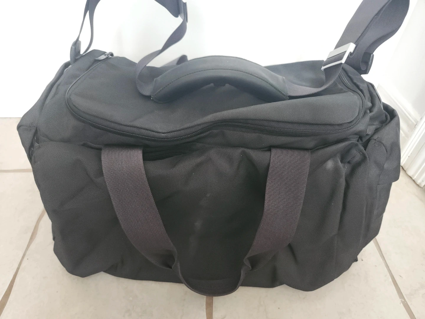 This is a black duffle bag. It has multiple straps for carrying and a main zippered compartment. There's also an interior zippered pocket. Heavy duty, can be used as luggage or gym bag.
