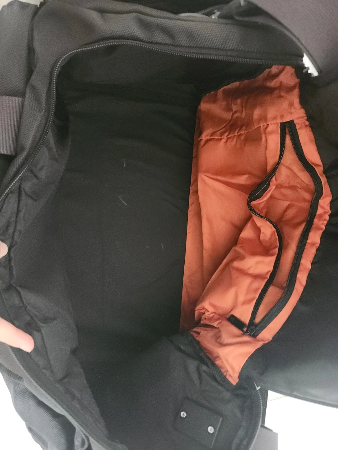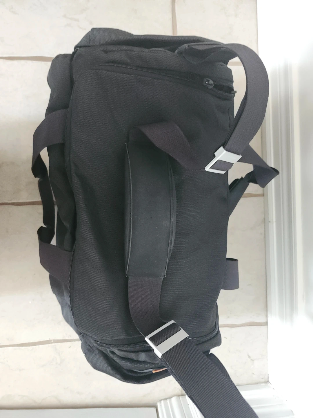 This is a black duffle bag. It has multiple straps for carrying and a main zippered compartment. There's also an interior zippered pocket. Heavy duty, can be used as luggage or gym bag.