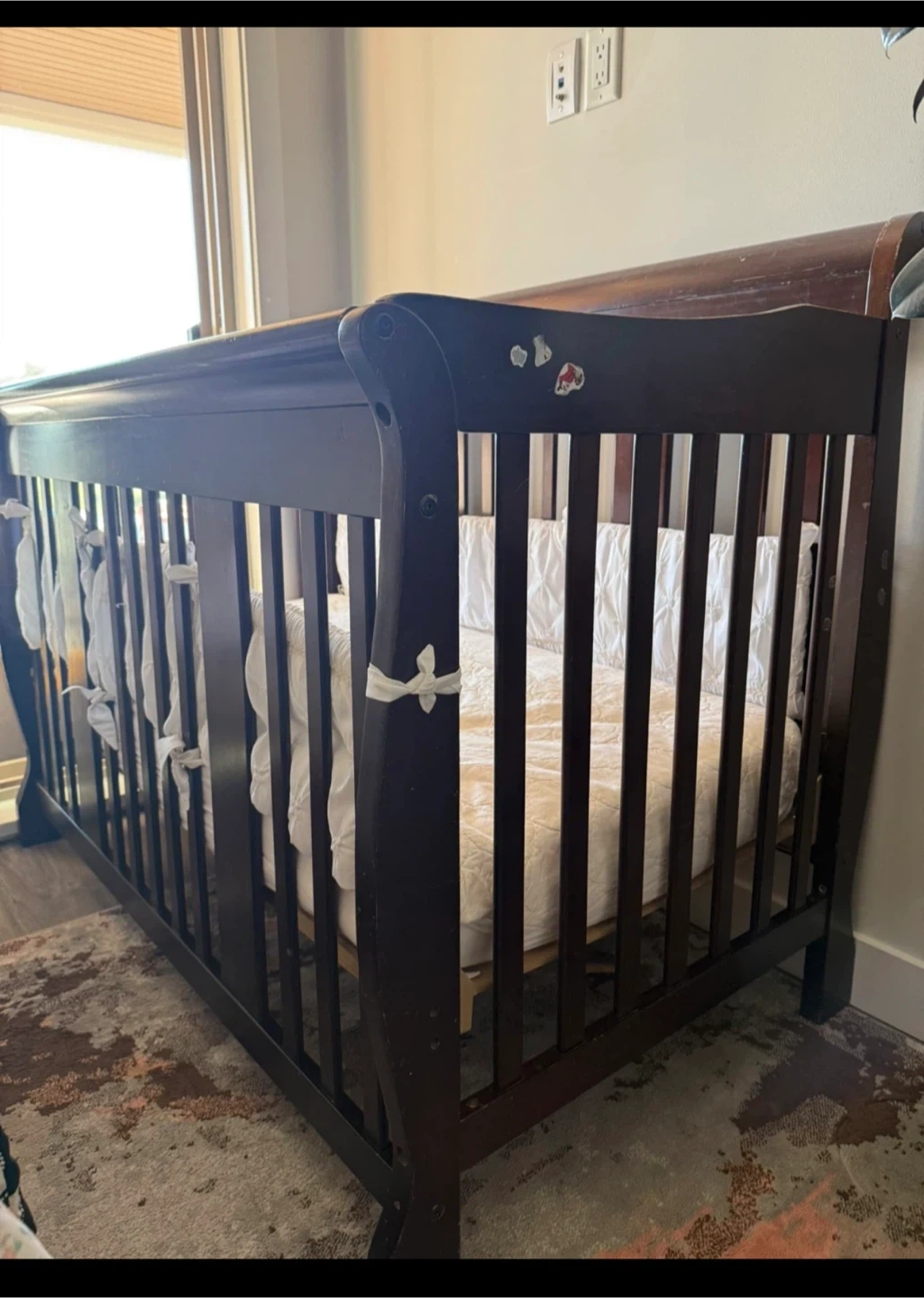 A dark wood sleigh style crib is shown. It includes a quilted mattress pad and a white bumper pad. This crib offers a sturdy and classic design for a nursery.