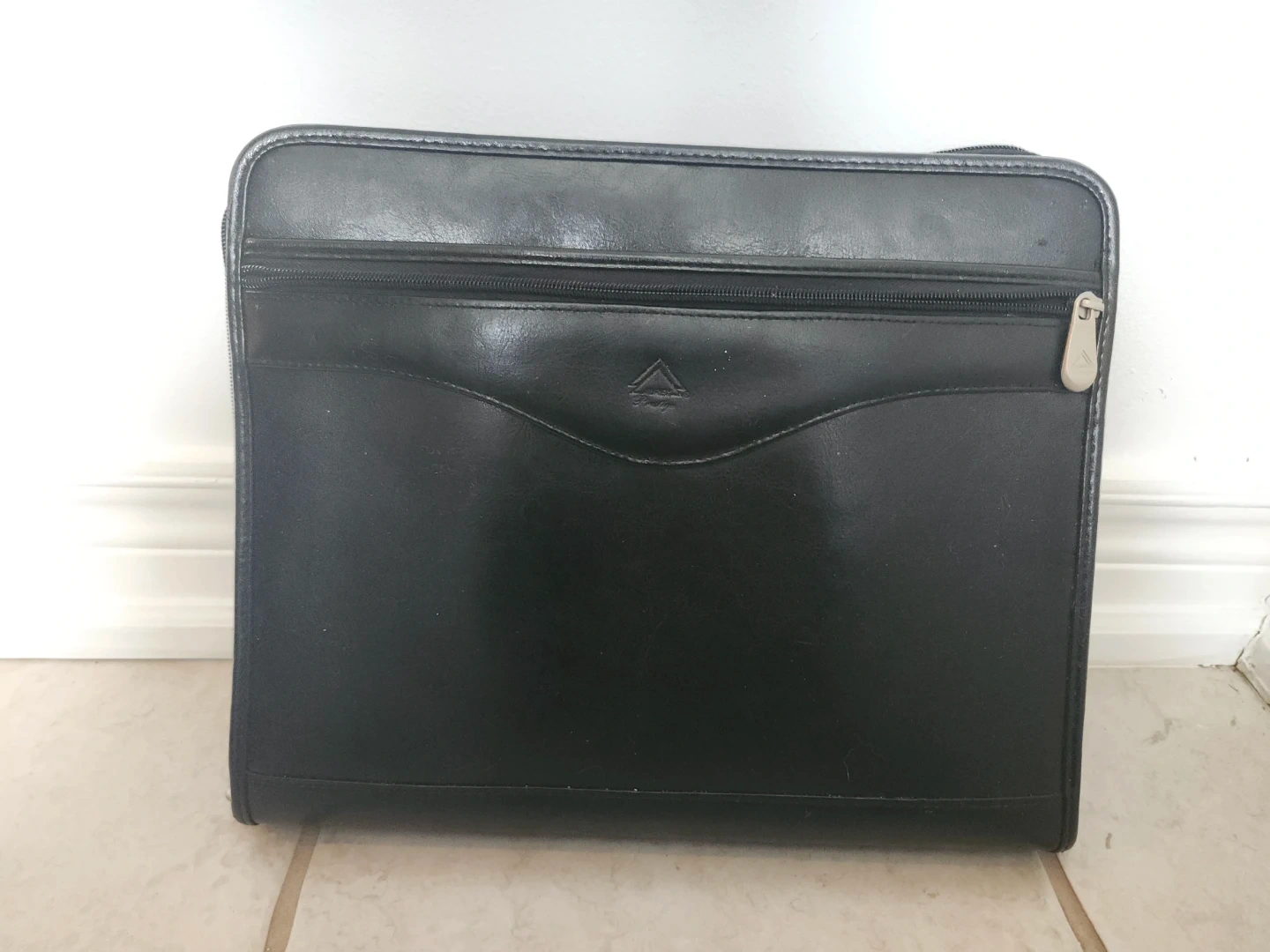 This Laurex Prestige briefcase is made of black leather. It features a zip-around closure and multiple interior pockets. The portfolio also has a 3-ring binder mechanism inside. It's suitable for carrying documents and laptop/iPad.