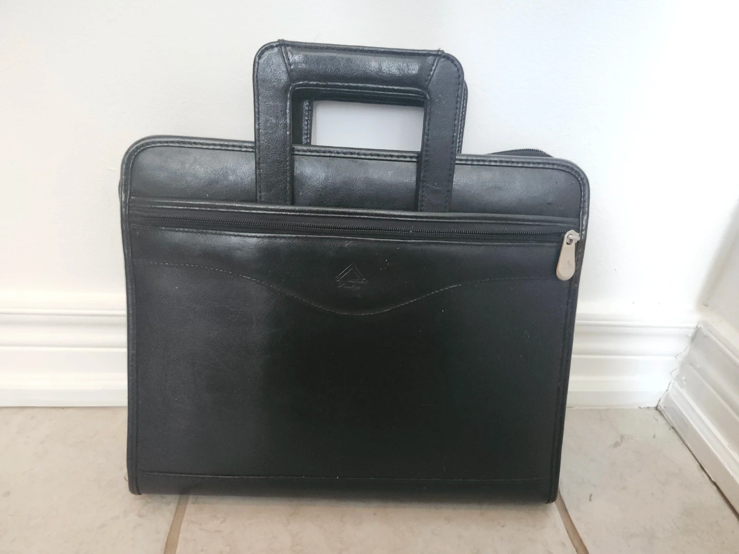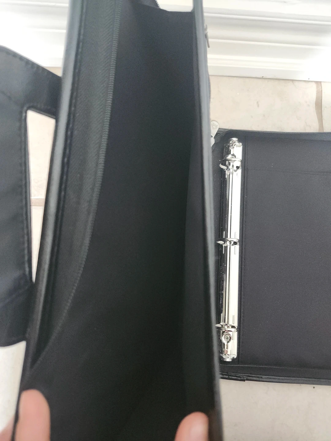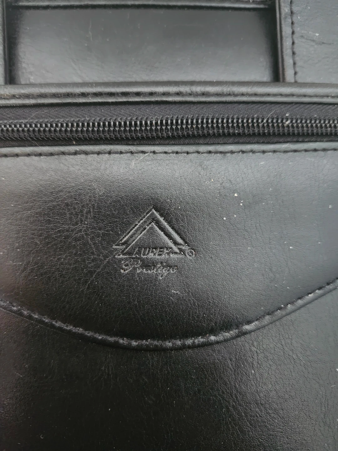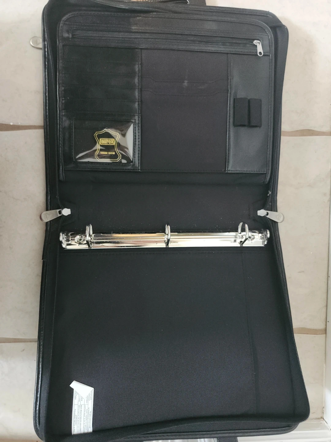 This Laurex Prestige briefcase is made of black leather. It features a zip-around closure and multiple interior pockets. The portfolio also has a 3-ring binder mechanism inside. It's suitable for carrying documents and laptop/iPad.