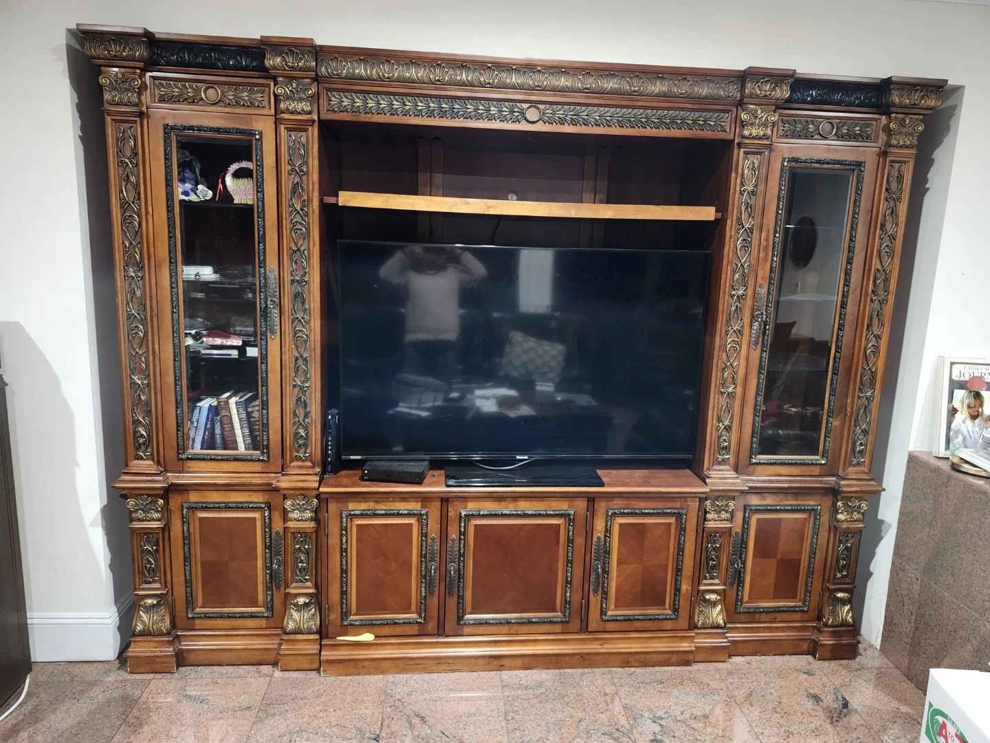 This large wooden entertainment center features intricate carvings and glass-paneled doors. It offers ample storage with multiple shelves and cabinets. It includes a central open space for a television. Assembly instructions are included.