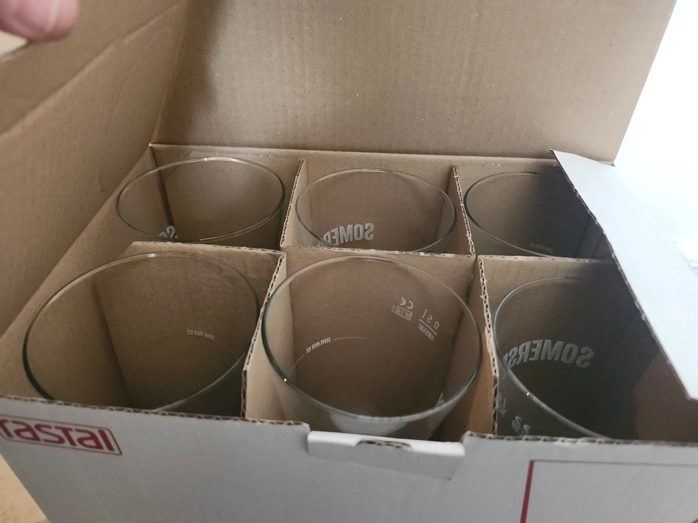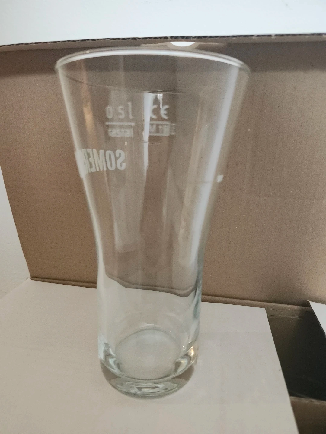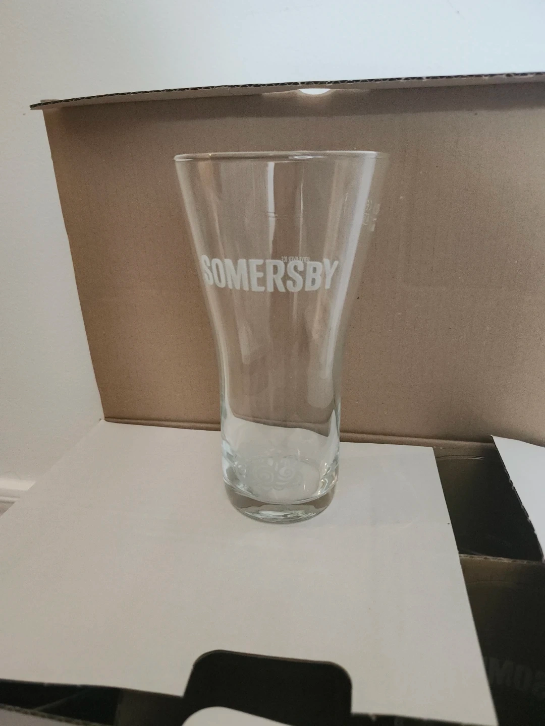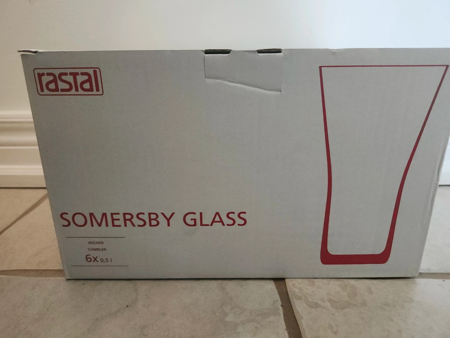 Set of six Somersby tumbler glasses. Each glass has a 0.5L capacity. These clear glass tumblers are perfect for enjoying your favourite beverages. New and comes in original box.