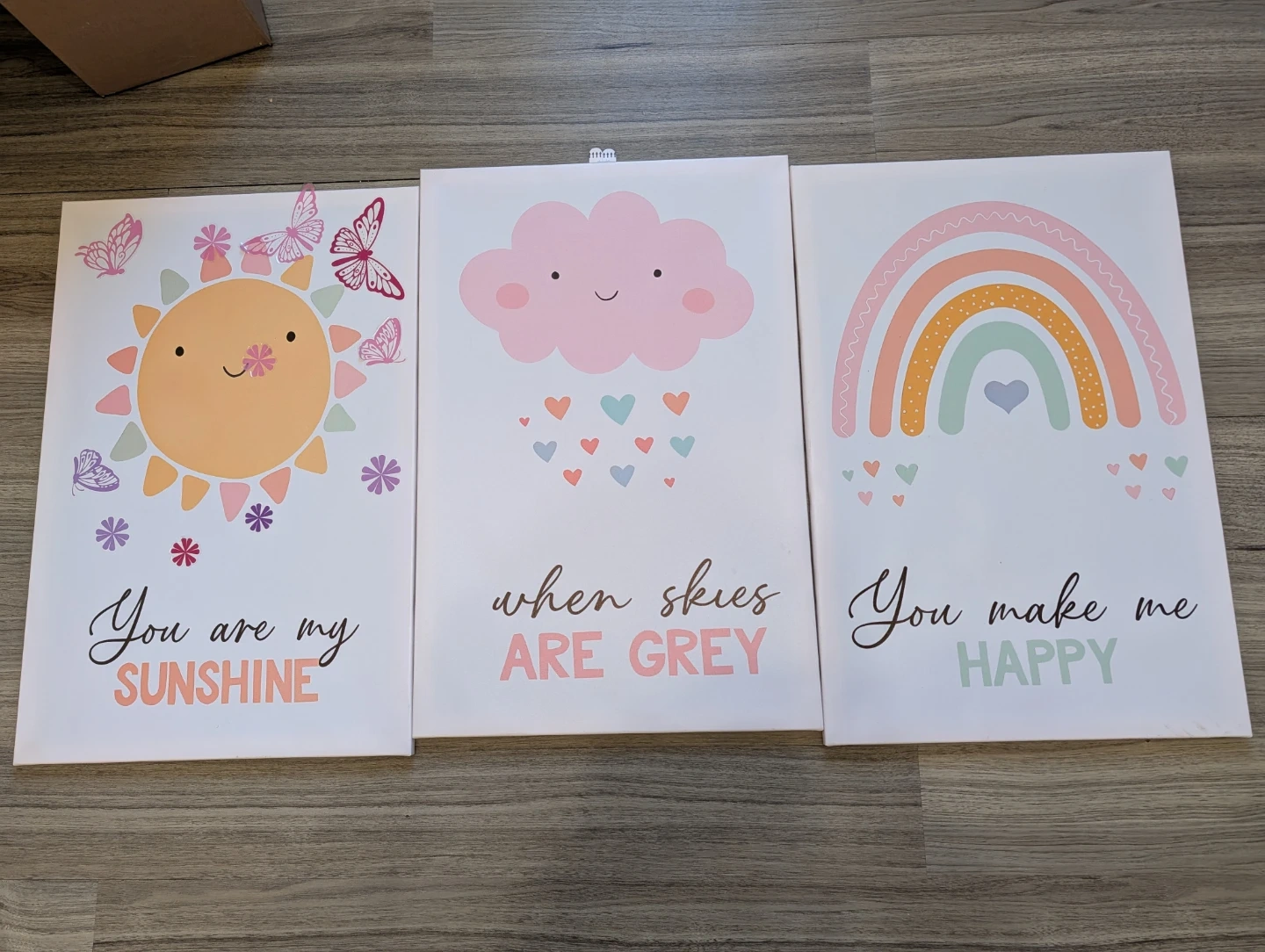 Set of 3 large decorative wall prints originally purchased for a newborn’s nursery.