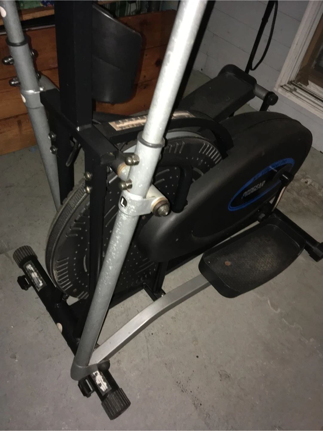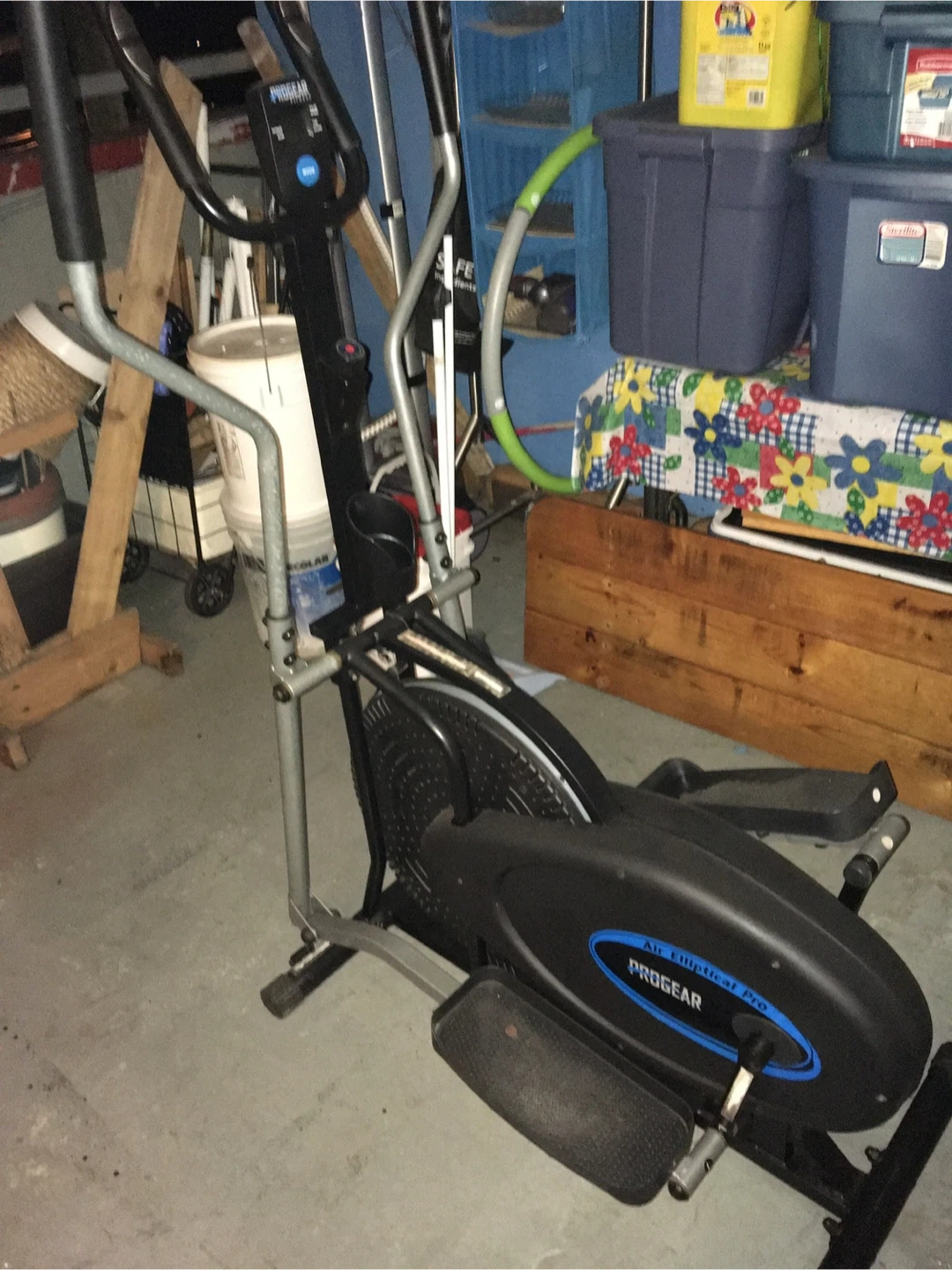 ProGear Air Elliptical Pro for sale. It has a digital display showing distance, scan, pulse, speed, time, and calorie count. The mode button is blue. This elliptical is great for a home workout.
