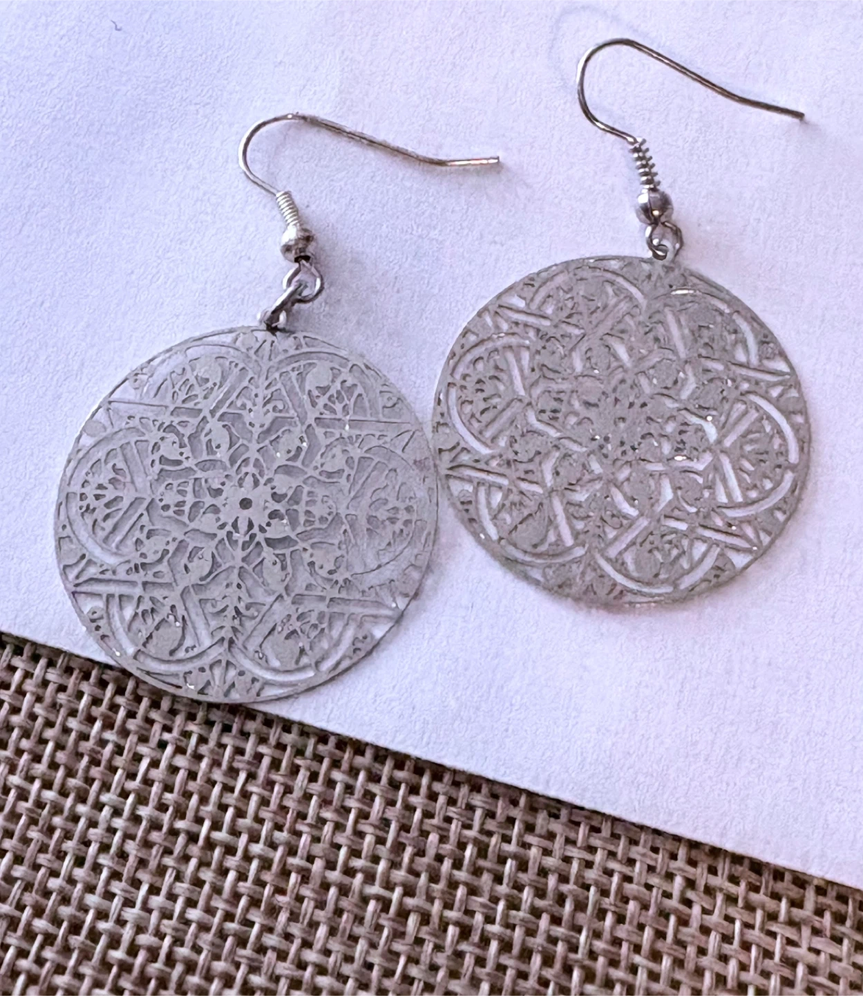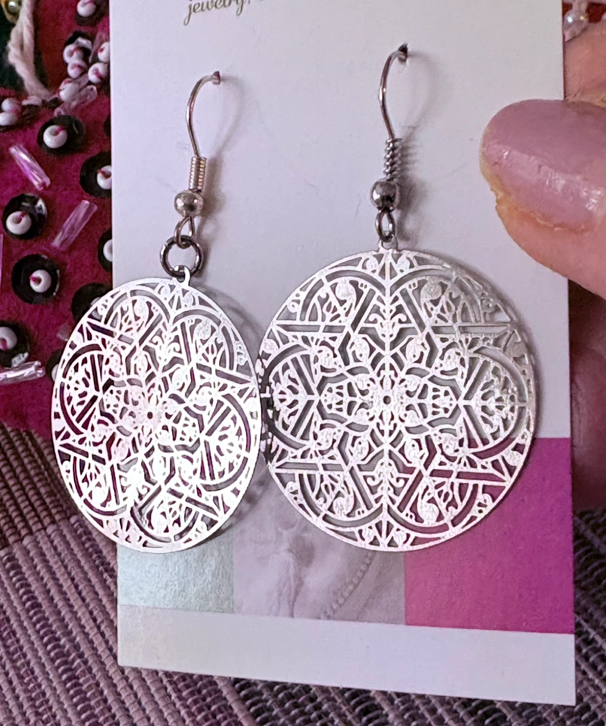 These silver-tone dangle earrings feature a delicate, intricate cutout pattern within a round frame. The metal hooks are securely attached. They're lightweight and designed for everyday wear.