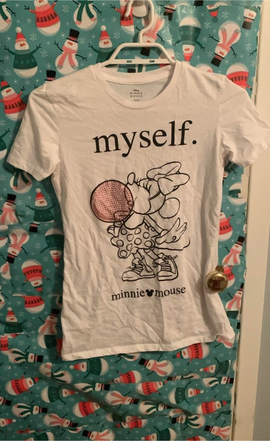 White short-sleeved t-shirt featuring Minnie Mouse graphic and the text 'myself.' It's made of soft cotton for comfort. A fun top for any Disney fan!