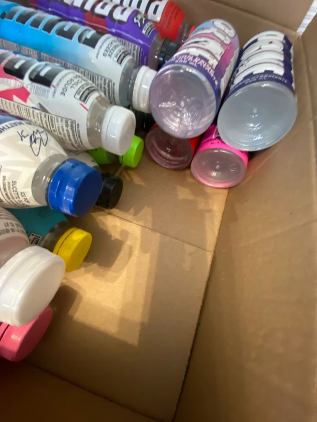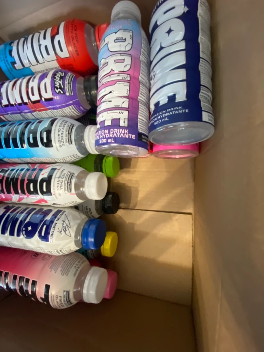 A collection of PRIME Hydration drinks in various flavours, each in a 500ml bottle. Flavours include Ice Pop, Blue Raspberry, Grape, Tropical Punch, Strawberry Watermelon, and Lemonade and much more. They are all empty