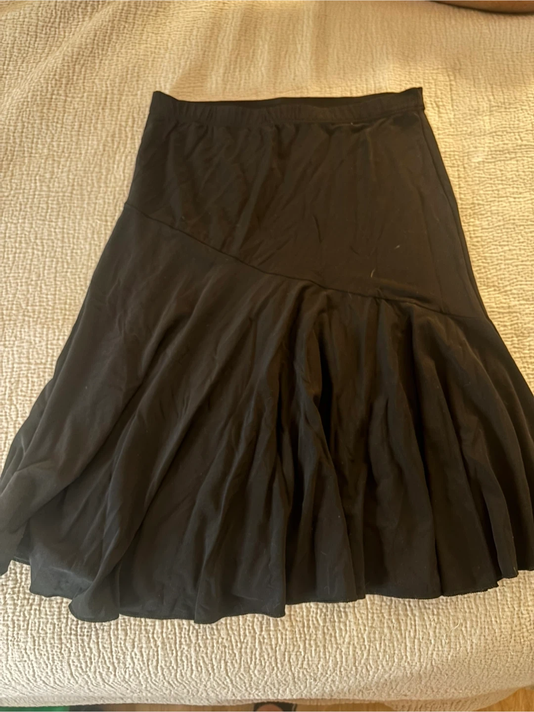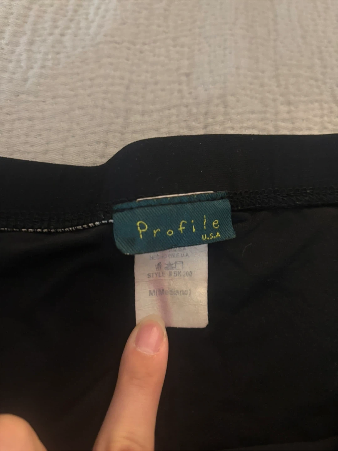 This is a black midi skirt from Profile USA. It's a size medium with a flowy design. The skirt is made of a comfortable fabric.