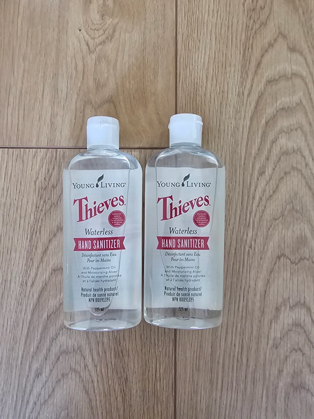 Two bottles of Young Living Thieves Waterless Hand Sanitizer are included. Each bottle contains 225ml. It's made with peppermint oil and moisturizing aloe. This natural health product is useful for keeping hands clean when soap and water aren't available.