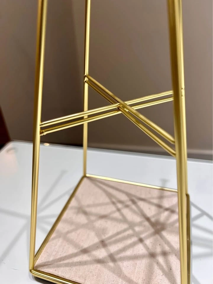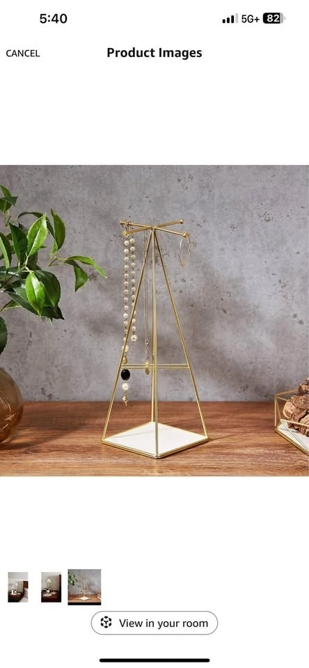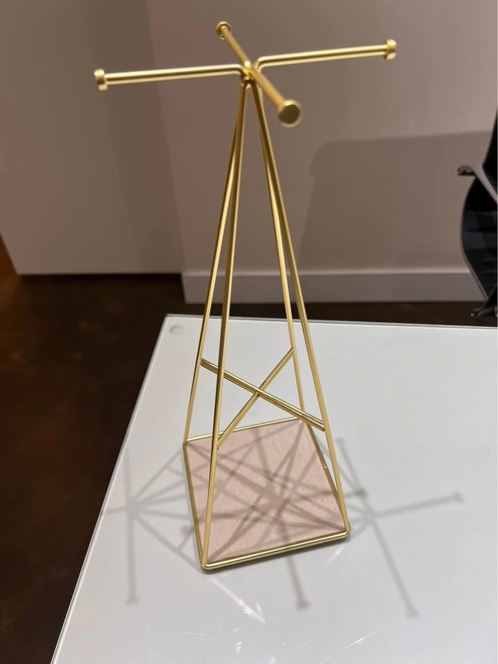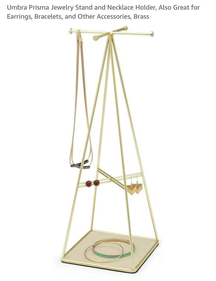Elegant jewelry stand with a small footprint. Beautiful metallic gold finish. Great for organizing necklaces, earrings, rings, and bracelets. Extra storage space at the bottom.