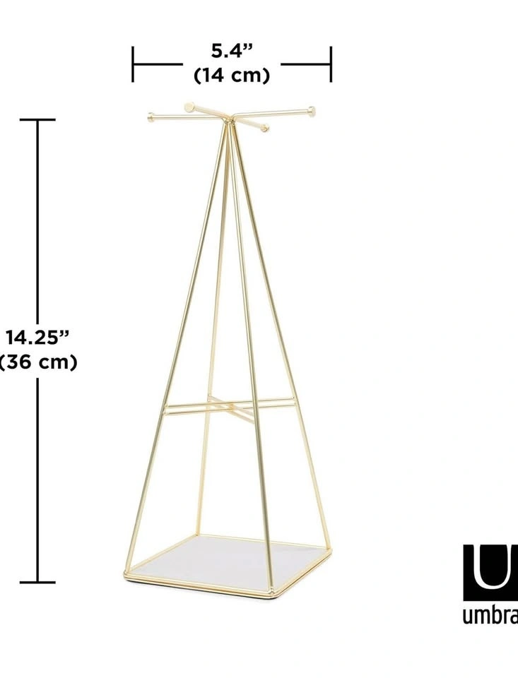 Elegant jewelry stand with a small footprint. Beautiful metallic gold finish. Great for organizing necklaces, earrings, rings, and bracelets. Extra storage space at the bottom.