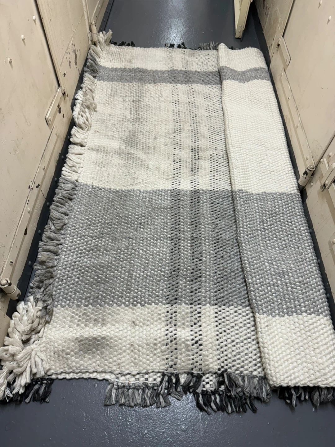 7 feet by 10 feet. Handmade plaid rug with black and white pattern. Has fringes on the edges. Half of the rug is clean & the other half is dirty. Please see pictures. This rug would add a cozy touch to any room!