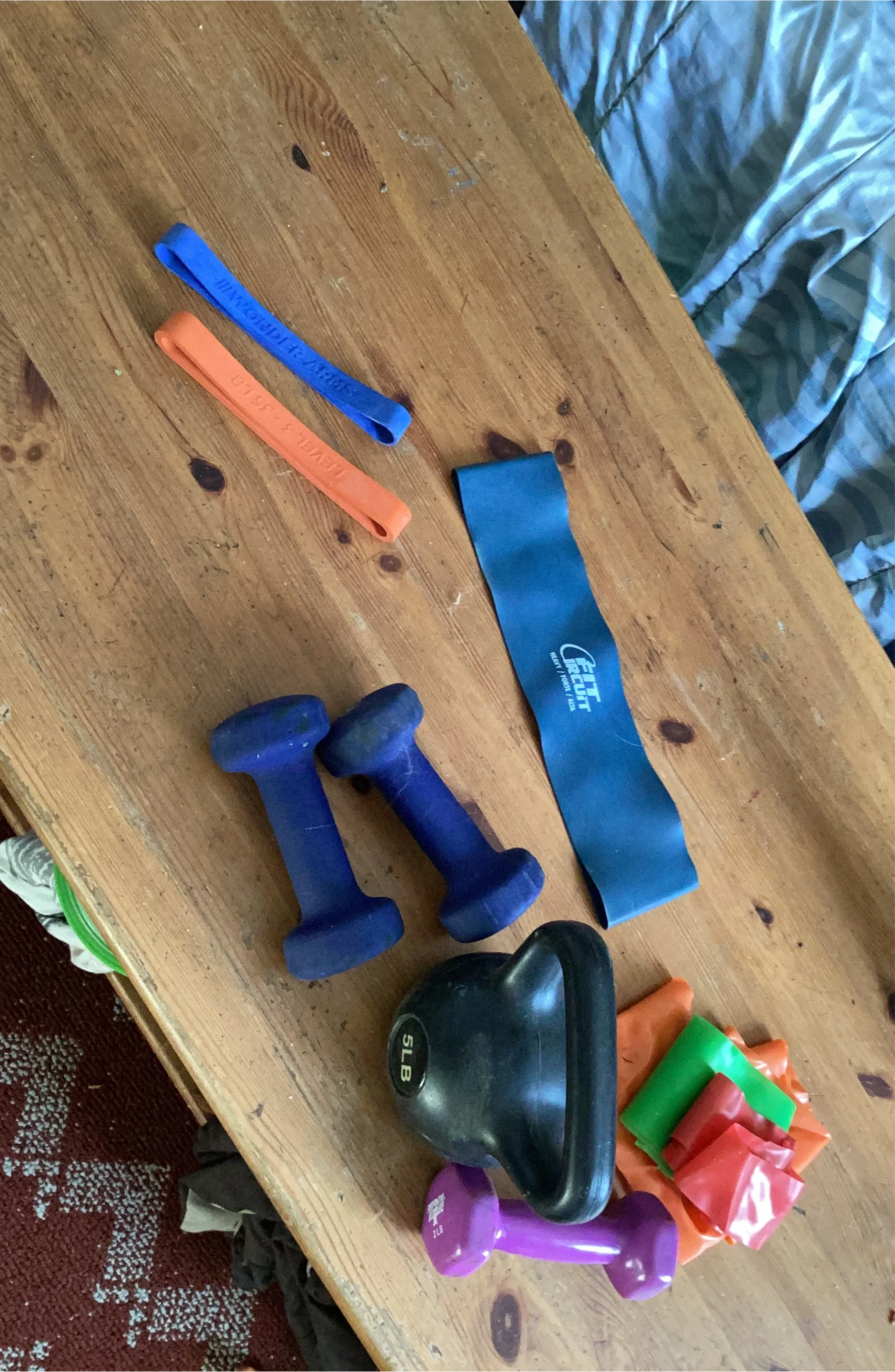 This set includes Fit Circuit resistance bands, a 5lb kettlebell, and two dumbbells. One dumbbell is 2lb, and the other pair is blue. Some bands are marked LEVEL 3 - 35 LB. It's great for home workouts!