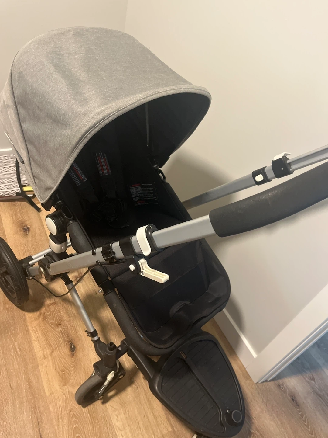 Grey Bugaboo Cameleon stroller with black seat. It's a versatile stroller, perfect for navigating different terrains. It has a reversible seat and adjustable handlebar.