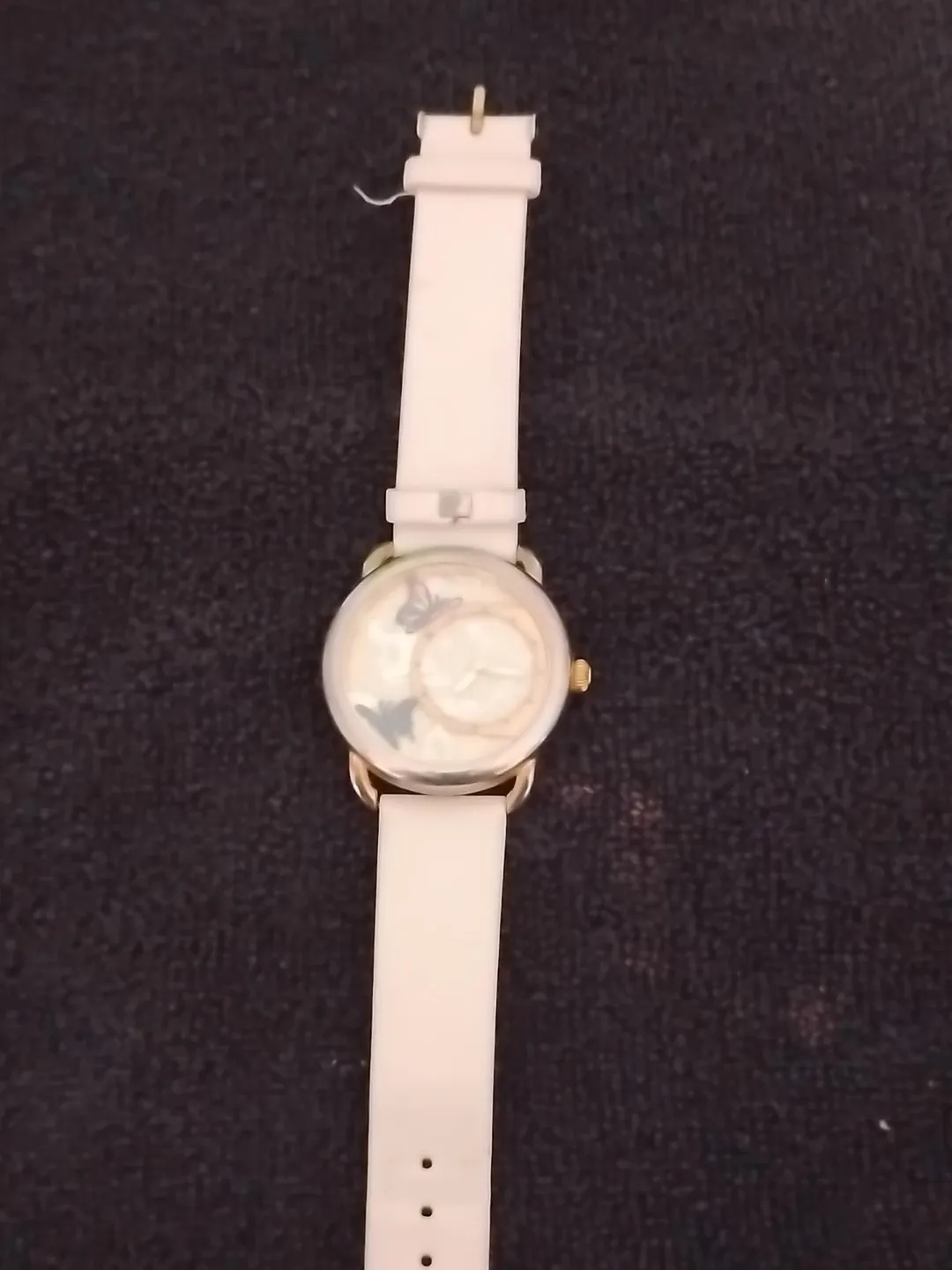 A lovely white band watch with a delicate butterfly design on the face. It's great for adding a touch of whimsy to any outfit. The band is adjustable for a comfortable fit.