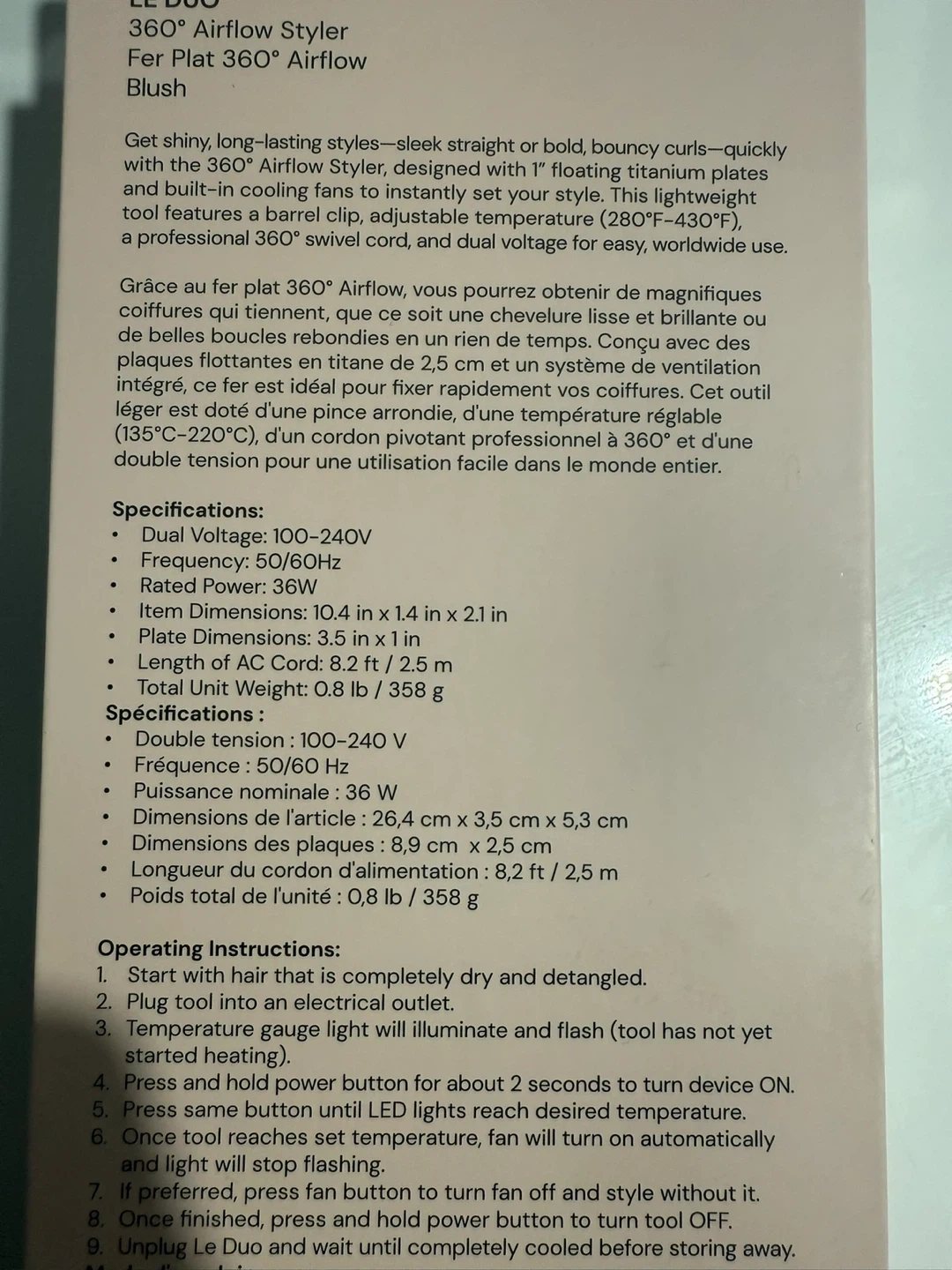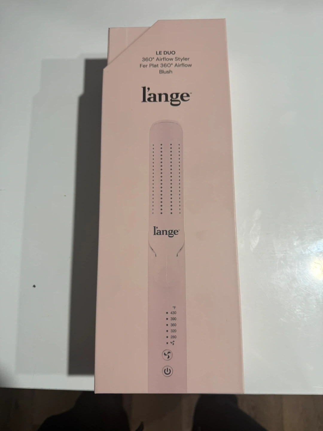 This is the L'ange Le Duo 360° Airflow Styler in Blush. It features 1" floating titanium plates and a barrel clip. The tool is dual voltage and has adjustable temperatures from 280°F-430°F.