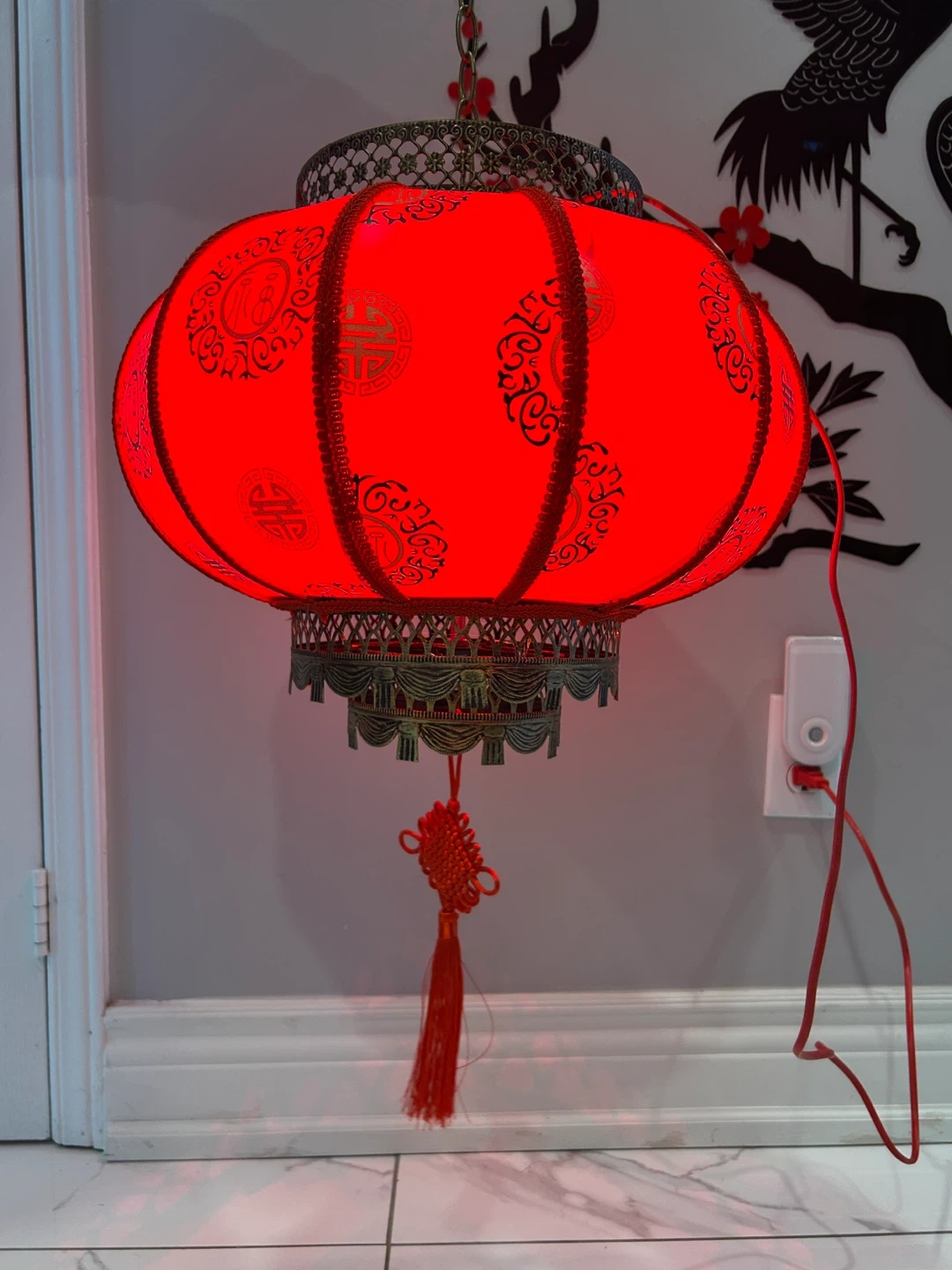 This bright red decorative lantern has intricate gold detailing and a tassel accent. It's perfect for adding a touch of festive ambiance to any space. The metal frame and fabric construction ensure durability. The lantern can be plugged in to provide a bright light, originally bought for $68+ tax. Now selling for $30.