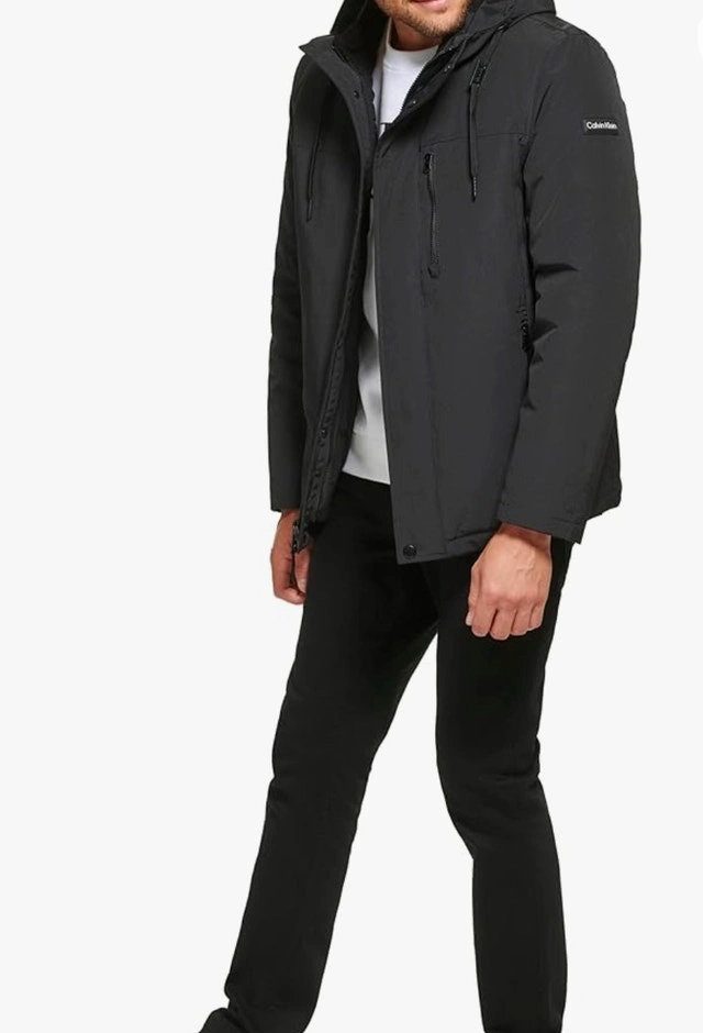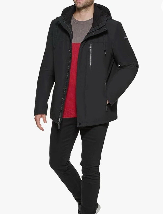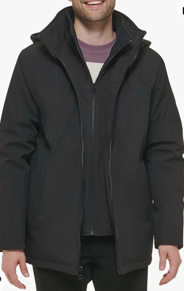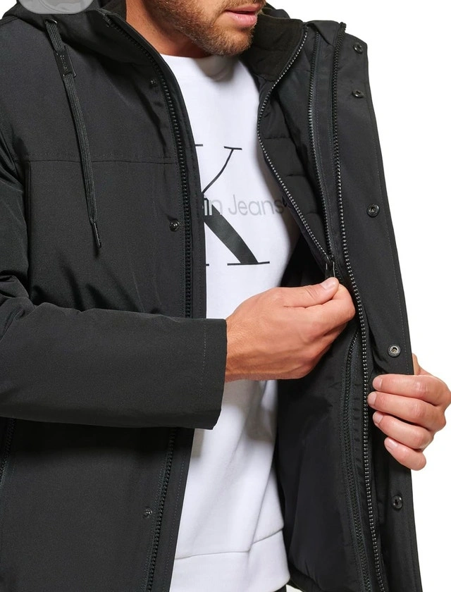 Calvin Klein Arctic 3 in 1 Systems Jacket. Outer Jacket: 85% Cotton, 15% Polyester. Inner Jacket: 100% Polyester. Machine Wash. Features: Hooded winter weather jacket, chest zipper pocket and 2 zipper pockets on side, water resistant outer shell, 3-in-1 systems jacket.