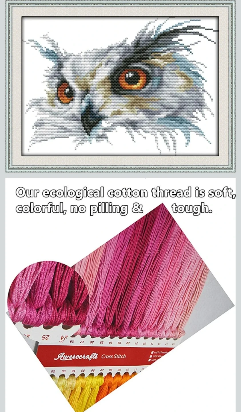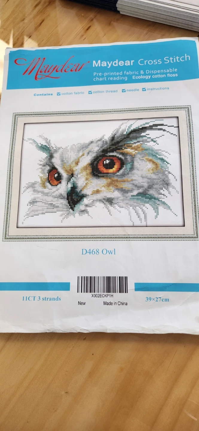 This is a Maydear cross stitch kit featuring an owl design, model D468. It includes a pre-printed fabric and eco-friendly cotton thread. The kit comes with a needle and instructions.