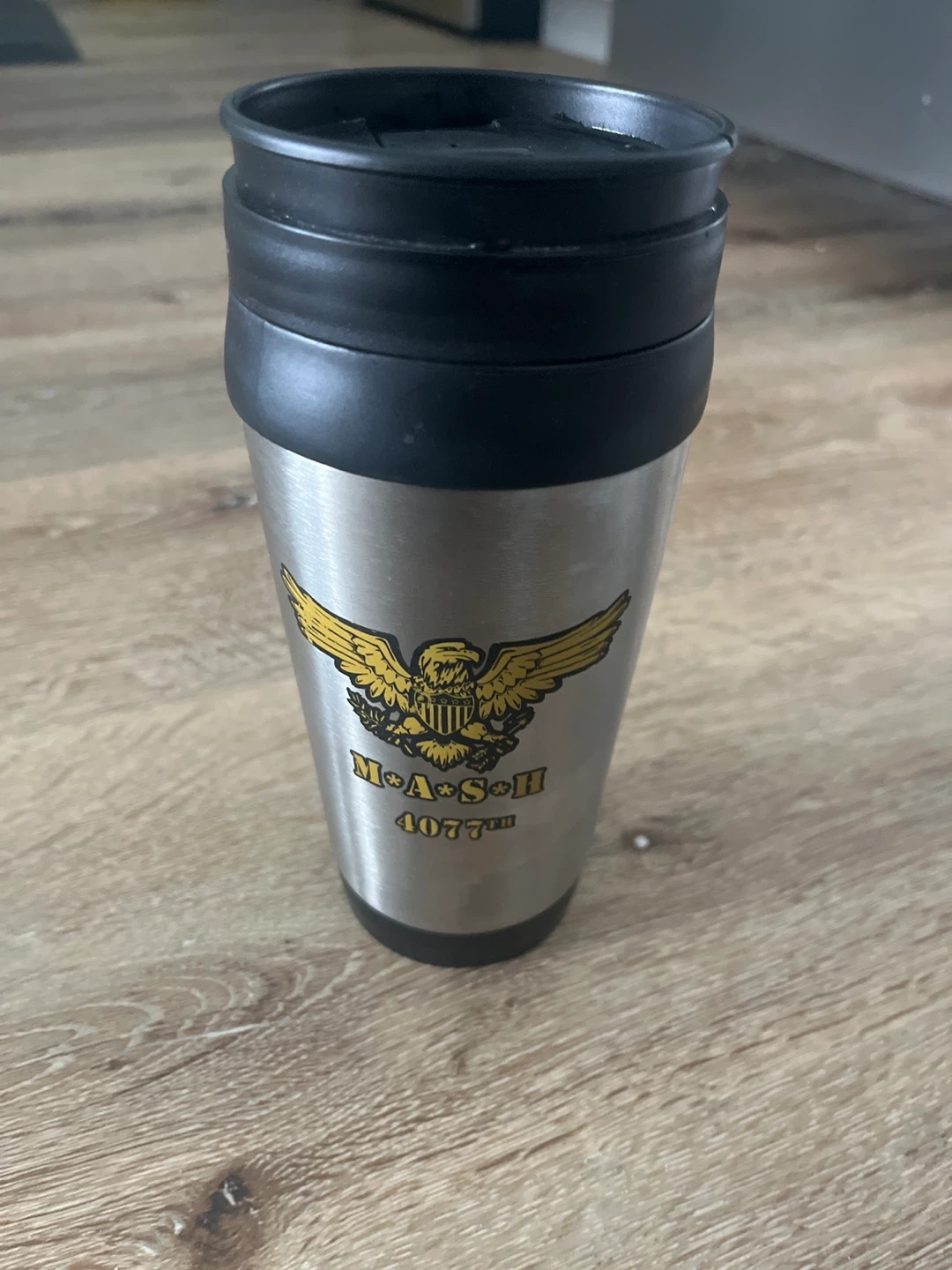 Reusable travel mug with M*A*S*H 407th emblem. Stainless steel construction with a black plastic lid and grip. It's great for keeping your drinks hot or cold on the go. A nice piece for any fan!
