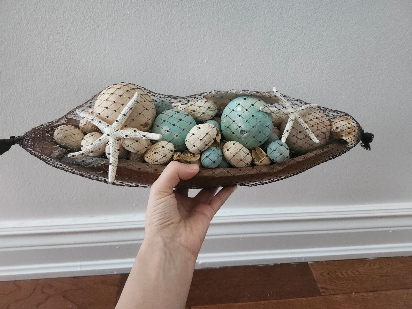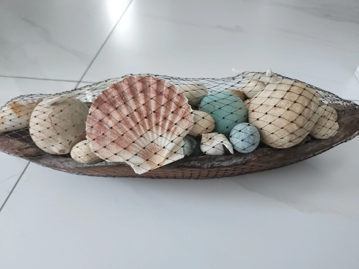 A decorative bowl filled with various shells, sea stars, and stones, all enclosed in a mesh net. It's a charming piece that brings a coastal vibe to any space. Some of the included elements are smooth stones, round decorative orbs, and natural shells.