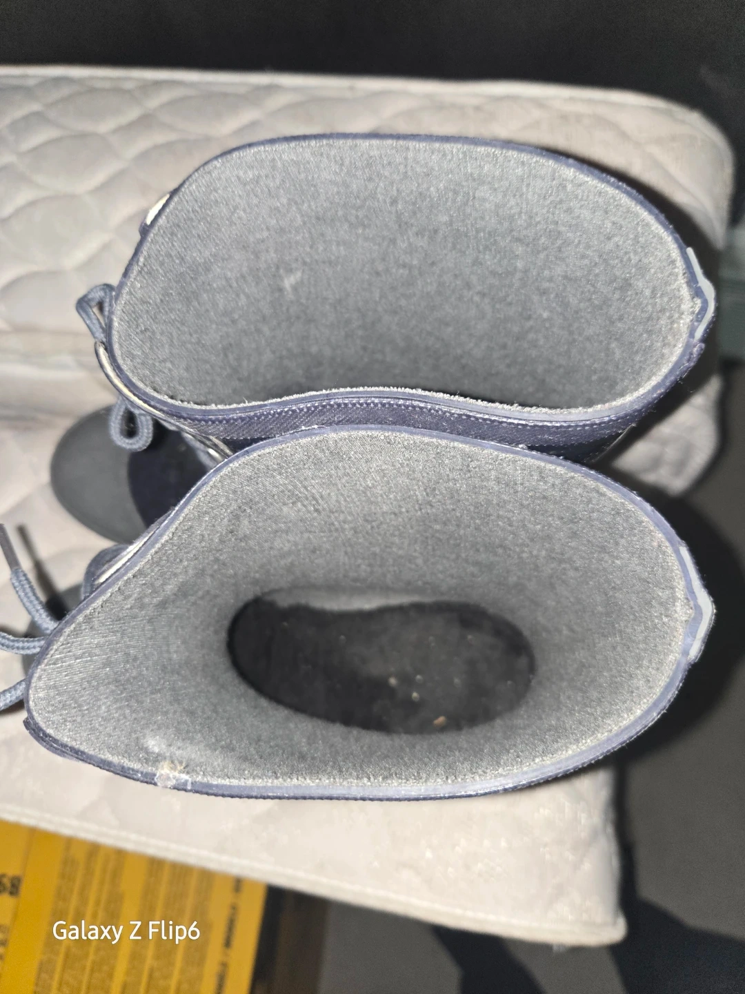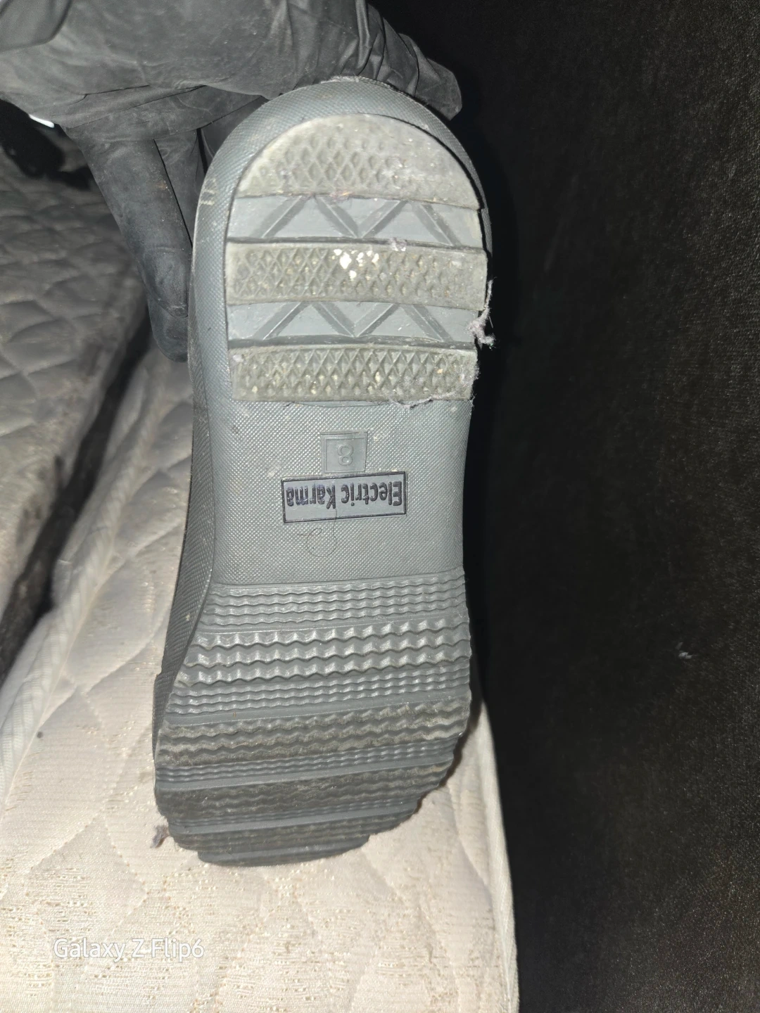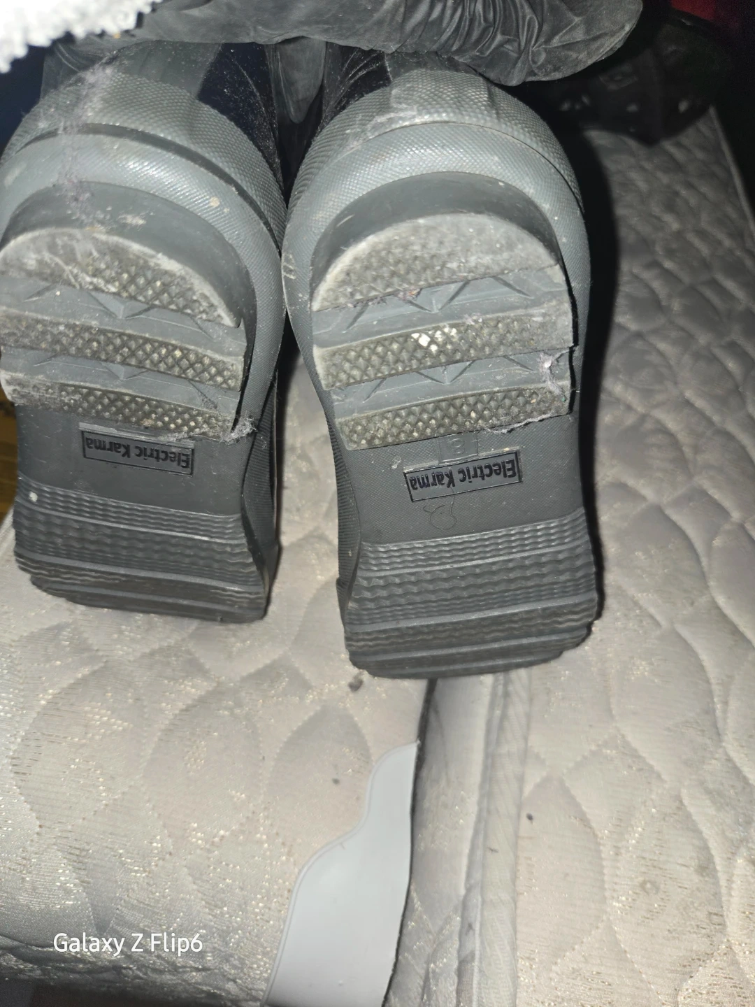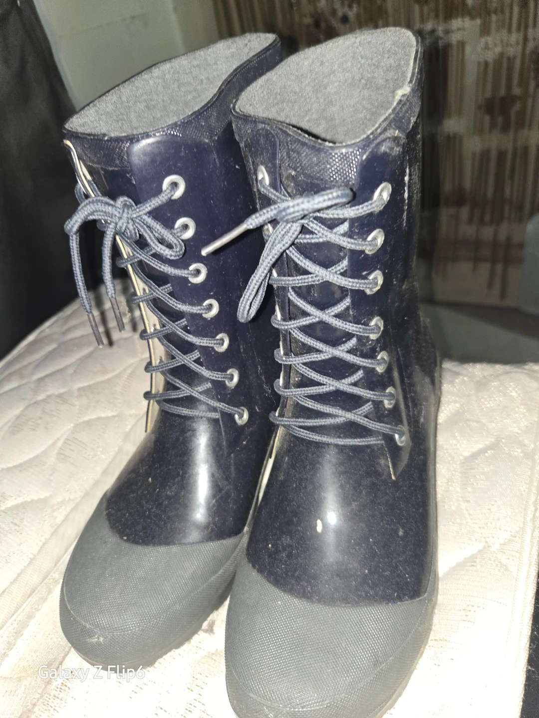 Navy blue rubber rain boots by Electric Karma. Lined for comfort and featuring a lace-up front. Size is 8. Great for puddle jumping!